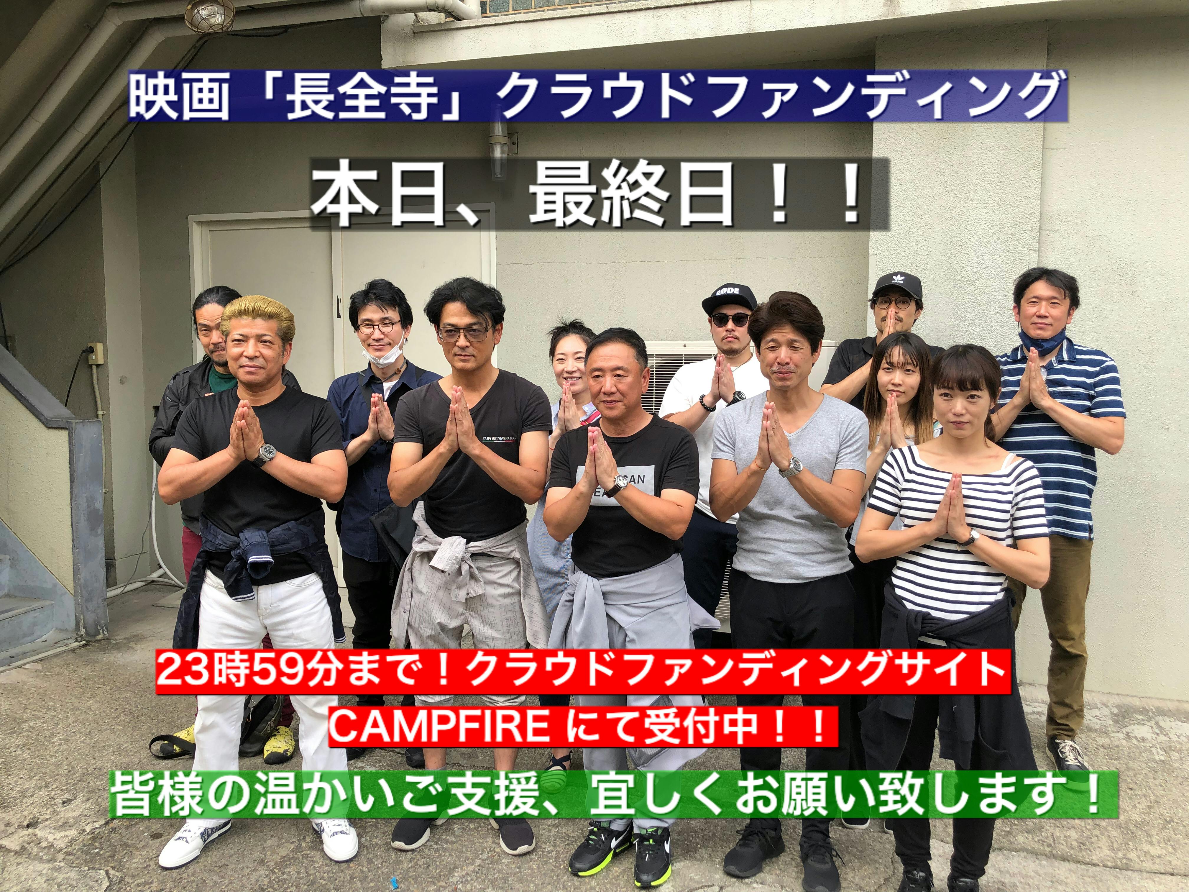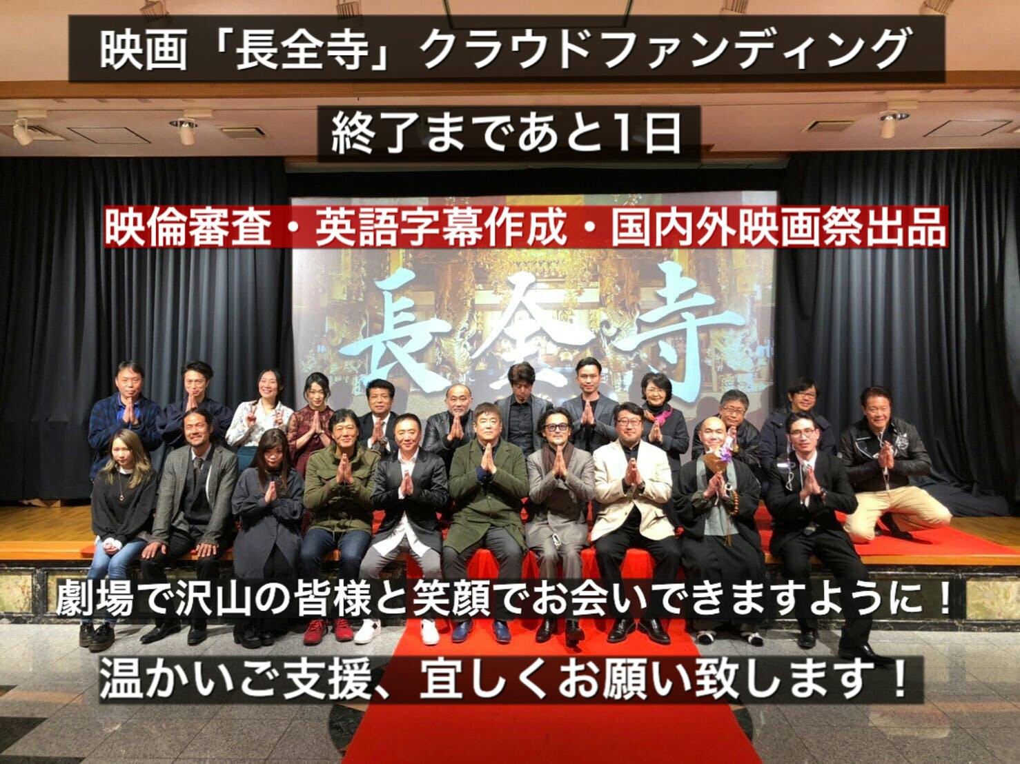 2021/06/30 11:36映画「長全寺」プロデュース・制作の47ENGINE です。約2ヶ月行ってきたクラウドファンディングも本日がいよいよ最終日となりました!本日23時59分まで本サイトにて受付をしております!代理支援も手続きの関係上、ギリギリの時間までとはいきませんが、23時頃まで受付を致します!国内外、沢山の皆様に本作をお届けしたいと願い、劇場公開のための映倫審査・英語字幕作成・国内外映画祭出品を目的に、クラウドファンディングに挑戦しております!これまでご支援、応援してくださった方に心より感謝の気持ちを込めて。そして、目標達成まであと少し!!最終最後まで、皆様の温かいご支援、シェア拡散などのお力添えをお願い申し上げます。沢山の皆様のとのご縁を頂き制作した本作、そしてこのクラウドファンディングを通して新たなご縁を頂きました!最終日となりましたが、一人でも多くの皆様とのご縁を願って。そして、沢山の皆様と劇場で笑顔でお会いできる事を楽しみにしております!「先祖がいたから私は今、ここにいる」「沢山の人とのご縁の中で私達は生かさるている」という、人と人との繋がりをテーマに制作した本作ですが、一般公開前に病に倒れた大切な仲間との悲しい別れがありました。私達の仲間で、一緒活動し、本作に出演した役者の越後拓哉、そして本作に楽曲を提供してくださった野島健太郎さん。もう会うことが叶わなくなったお二人ですが、越後は笑顔で、そして野島さんの作ってくださった音楽は本作で生き続けています。お二人の名前を上げさせて頂きましたが、この作品に携わって下さった全ての方の想いを、これから国内外、沢山の方に届けていきたいたいと思います。そして本作を、ずっとずっと大切にしていきます。皆様とのご縁に心より感謝して。映画「長全寺」をこれからも宜しくお願い致します。登録不要フォーム入力だけで簡単支援、代理手続きはこちらから↓https://www.47engine-eiga.com/クラウドファンディングサイトからのご支援はこちらから↓https://camp-fire.jp/projects/view/414029 もっと見る