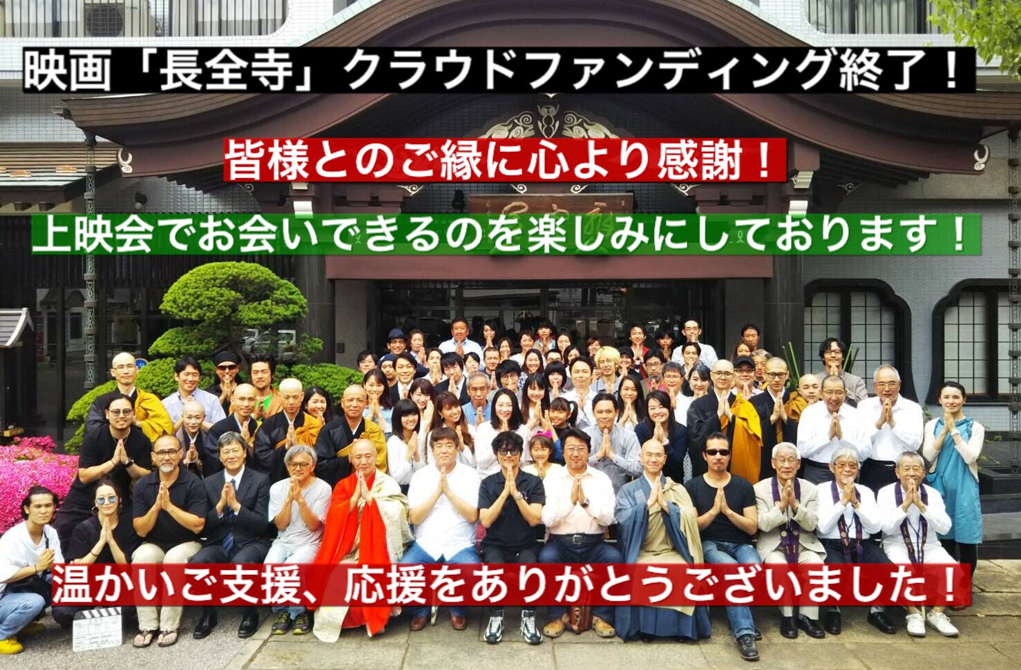 2021/07/01 00:02映画「長全寺」プロデュース・制作の47ENGINEです。4月25日からスタートしたクラウドファンディングが先程、終了致しました!本プロジェクトは、100名以上の皆様からご支援頂き、(※代理支援のアカウントより複数の方にご支援頂いたため、実数は現在集計中で、サイトの表示の人数と異なります。)総支援額は1401000円となりました!※詳細はこちらからご覧いただけます。https://camp-fire.jp/projects/view/414029私達の力不足で目標金額に到達することができず、大変申し訳ありませんでしたが、沢山の皆様から頂いた温かいご支援、お気持ち、励ましのお言葉に、心より感謝しております。本当にありがとうございました。(※目標金額には達しなくても、ご支援頂いた総額から、クラウドファンディングサイトの手数料を引いた金額を頂く事ができるのでご安心ください。)皆様から頂いたご支援で、これから英語字幕作成・映倫審査・国内外映画祭出品に向けて動き出し、国内外、多くの方に本作をお届けしていきたいと思います!また、キャンプファイヤーのサイトからご支援頂いた方の本名やご連絡先は、クラウドファンディング終了後に知らされるため、今、やっと管理者の私達も知ることができました。これからキャストや関係者に知らせ、随時、それぞれのSNSや応援して頂いたキャスト個人からもお礼のご連絡などをさせて頂きたいと思いますが、この感謝の気持ちは是非お会いして直接、お伝えしたいと思っていますので、皆様と上映会でお会いできる日を楽しみにしております!このクラウドファンディングを通じて、沢山の皆様とのご縁が出来たこと、そして本作を多くの方に知ってもらうことができた事を本当に嬉しく思っています!支援して下さった皆様、激励のメッセージをくださった皆様、クラウドファンディング初挑戦で何もわからない私達に、アドバイスを下さったり、シェア、拡散などにご協力して下さった皆様、応援してくださった全ての皆様に、感謝の気持ちでいっぱいです!本当に本当にありがとうございました。上映会の情報や、進捗状況は、映画「長全寺」のホームページや、SNSでも発信していきますので、これからも映画「長全寺」を宜しくお願い致します。映画「長全寺」ホームページhttps://www.47engine-eiga.com/47ENGINE 一同 もっと見る