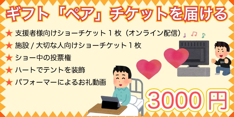 まず、パフォーマンスをご覧になるお客さま=支援者さまに「ペアチケット」を購入いただきます。そのうち一枚は支援者さまご自身のチケットとしてお使いいただき、もう一枚を皆さんからの「ギフト」として施設の皆さん、もしくは支援者さまの大切な人にお届けいたします。そのことで、支援者さまと「ギフト」を受け取った人がオンラインで繋がり、「私たちのパフォーマンスを通してみなさんの応援の気持ちを届けたい」と思っております。