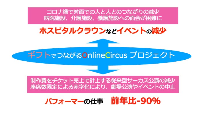 私たちは、世界に羽ばたく日本人パフォーマーを応援・サポートし、ともに学ぶエンターテインメントパフォーマーの団体です。毎年4月にラスベガスで行われるサーカスフェスティバルに参加するなど、私たちは、世界へ進出するために活動してきました。しかし、コロナ禍の影響で2020年のフェスティバルは中止になり、海外はもちろんのこと、日本の中でもパフォーマンスをする機会が激減してしまいました。そんな中でも、「私たちのパフォーマンスを必要としてくれるところは絶対にある!」そう信じてこのコロナ禍を模索してきました。そして出た答えが[ギフト]で繋がるオンラインサーカスでした。