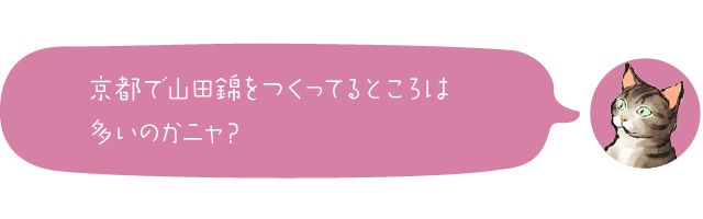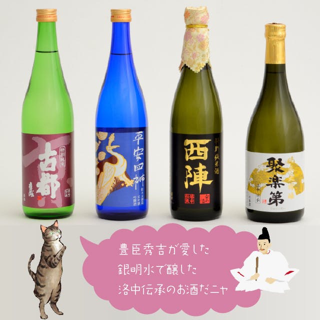 かつて豊臣秀吉の邸宅であった「聚楽第」跡地のちょうど南の端で酒造りをしているという縁もあり、代表銘柄には「聚楽第(じゅらくだい)」・「古都」などがあります。香り高く、スッキリきれいめなお酒を目指しています。