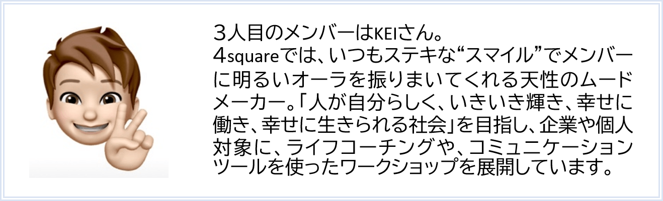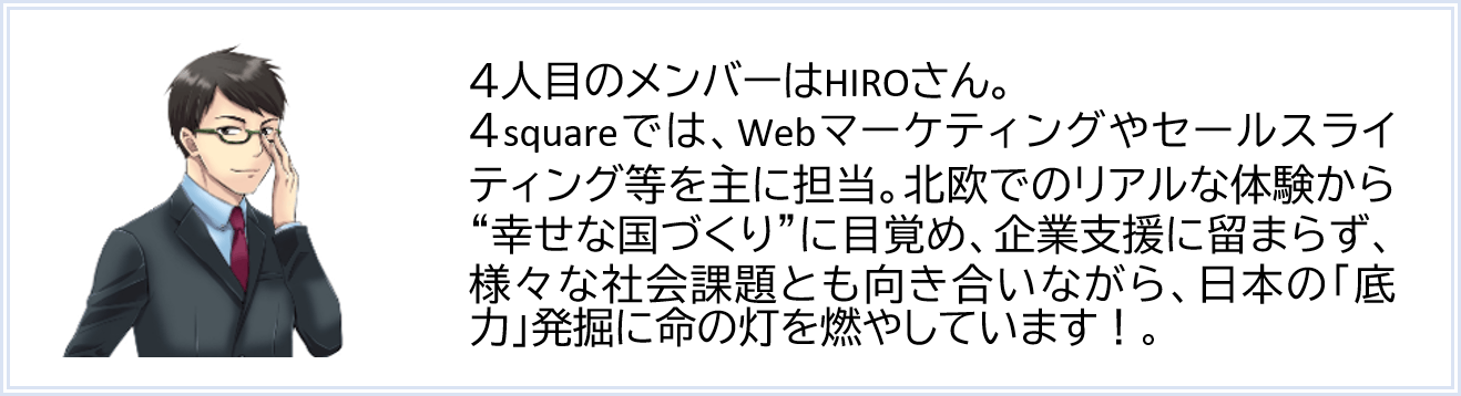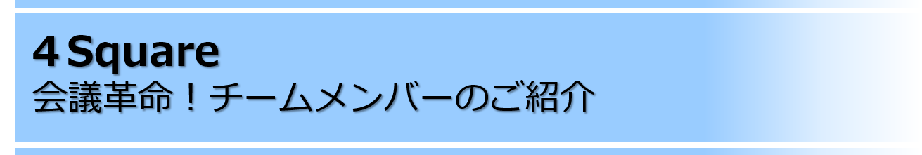 私たちは、経営者も従業員もHAPPYにする "会議革命" を日本全国の企業に起こすべく、2021年1月に立ち上げた「4Square (フォースクエア)」という、4人編制のビジネスチームです。