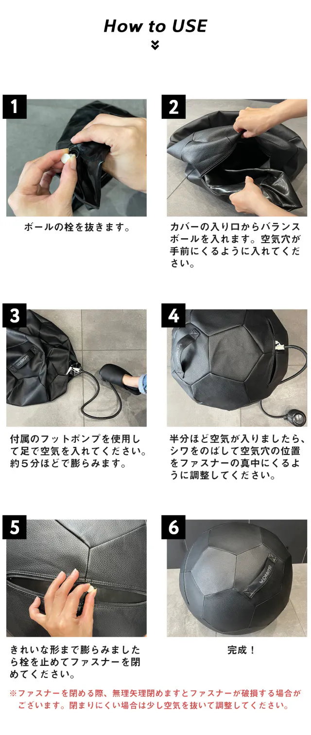 中のボールを軽く押しながらファスナーを閉めていただけますと閉まりやすくなります。