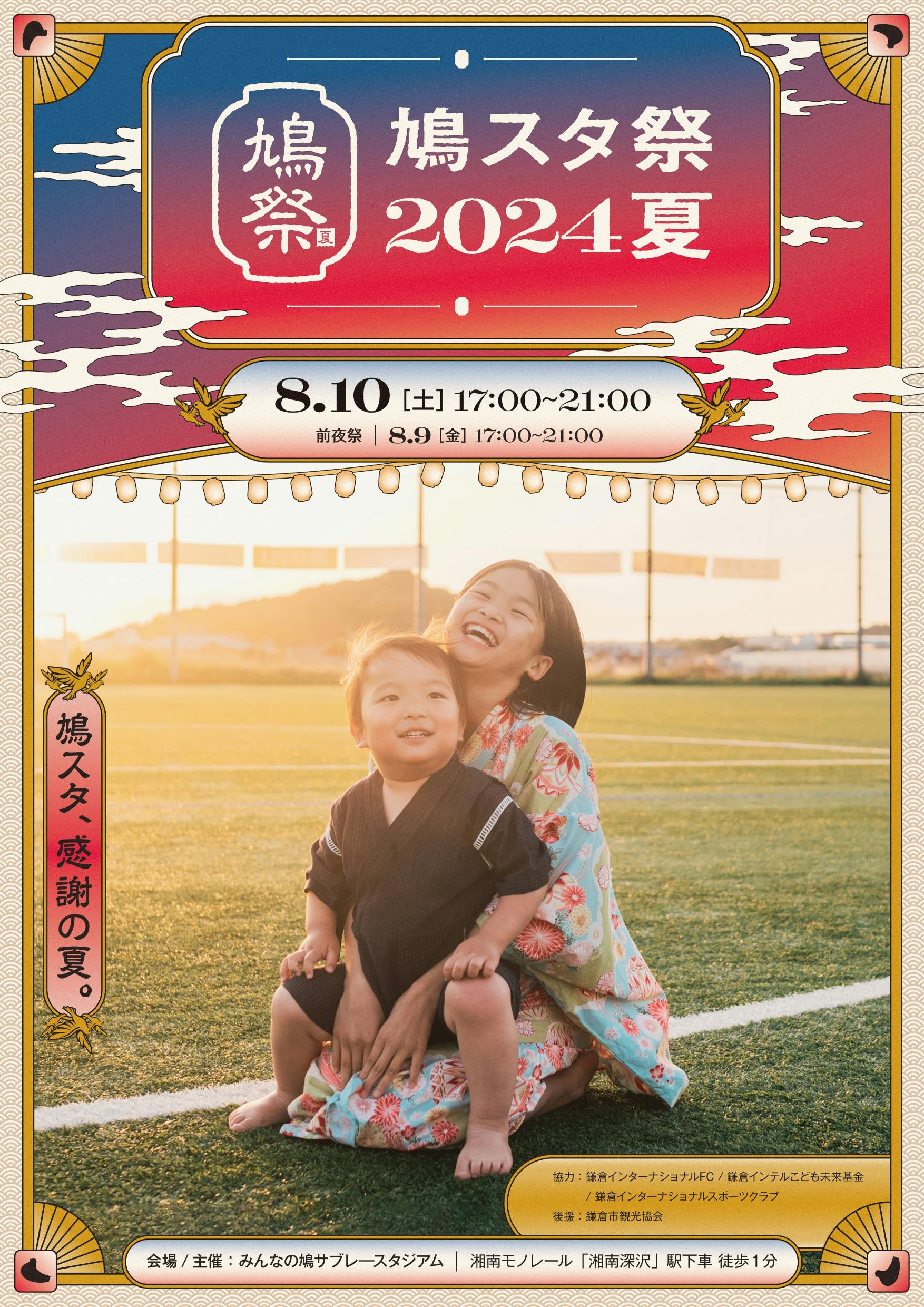 2024/08/08 12:00平素よりお世話になっております。いよいよ今週末、8月10日(土)は最後の「鳩スタ祭 2024 夏」を開祭!11月24日(日)を予定している「みんなの鳩サブレースタジアム」の運営終了に伴い、今回が最後の「鳩スタ祭」となります。鳩スタに、最後の夏がやってきます。この場所で過ごした数々の思い出を振り返ると、とても寂しい気持ちが押し寄せてきますが、これまでの思い出とは比べ物にならないくらい、楽しく、美しい思い出をみんなで一緒につくりましょう。みんなに「ありがとう」を伝えられる日に。みんなと一緒に、「ありがとう」を伝えられる日に。ありがとう、みんなの鳩サブレースタジアム。【鳩スタ祭 2024 夏】■主催みんなの鳩サブレースタジアム■協力鎌倉インターナショナルFC鎌倉インテルこども未来基金鎌倉インターナショナルスポーツクラブ■各ブース・エリア協賛洋光台 にこにこ不動産Pain de Nanosh有限会社波形住建明治安田キリンビバレッジ株式会社有限会社ホテイ産業研究所湘南モノレール株式会社株式会社古河塗装株式会社スピック■後援公益財団法人鎌倉市観光協会■開催会場みんなの鳩サブレースタジアム〒247-0063 神奈川県鎌倉市梶原634-1湘南モノレール「湘南深沢」駅 下車 徒歩1分■開催日時前夜祭(鳩スタサッカーフェスティバル):8月9日(金)17時〜21時鳩スタ祭:8月10日(土)17時〜21時※小雨決行、荒天時は8月11日(日)に規模を縮小しての開催を予定しております。■内容・詳細・8月9日(金)各種キッチンカー、鎌倉インテルサッカースクール生・参加希望のあった鎌倉市内の4種サッカークラブ(5・6年生)の交流試合や大人のPK戦などのサッカーフェスティバル※鎌倉インテルサッカースクール生以外のサッカーフェスティバルの参加お申し込みは終了しておりますのでご了承ください。8月9日(金)のイベント情報、スケジュール、注意事項は下記URLをご確認ください。https://hatostadium.com/news/soccer-fes-240809※拡大したマップはこちらをタップしてご確認ください。・8月10日(土)各種キッチンカー、出店及びイベントプログラム8月10日(土)のイベント情報、スケジュール、注意事項は下記URLをご確認ください。https://hatostadium.com/news/hatosta-fes-240810※拡大したマップはこちらをタップしてご確認ください。鳩スタ入口の総合案内所隣のブースでは移転先の「ゴールドクレストスタジアム鎌倉」の模型を展示しております。皆さまどうぞお立ち寄りください!■INTER LAB.開設プリントシートのデザインを選んでその場で圧着するオリジナルカスタマイズTシャツを販売!1.綿100%とポリエステル100%の2種類のボディからお好きなものをお選びください。(ボディは種類によって変動。税込3,000円〜)2.20種類以上のデザインからお選びいただいたシートをお好きなように配置いただき、その場でプリントします。(シート税込300円/枚)一緒に自分だけのオリジナルTシャツをつくりましょう!■鳩スタグッズ登場!タオルハンカチを販売!みんなの鳩サブレースタジアムロゴと鳩スタをモチーフとしたイラストロゴをデザインしたタオルハンカチを販売します。鳩スタをモチーフにした可愛らしいグッズで気分を高めましょう!皆さまのご来場をお待ちしております!--みんなのスタジアム構想プロジェクト事務局(鎌倉インターナショナルFC/一般社団法人鎌倉スポーツコミッション)みんなの鳩サブレースタジアム〒247-0063神奈川県鎌倉市梶原634-1https://kamakura-inter.comhttps://hatostadium.com もっと見る