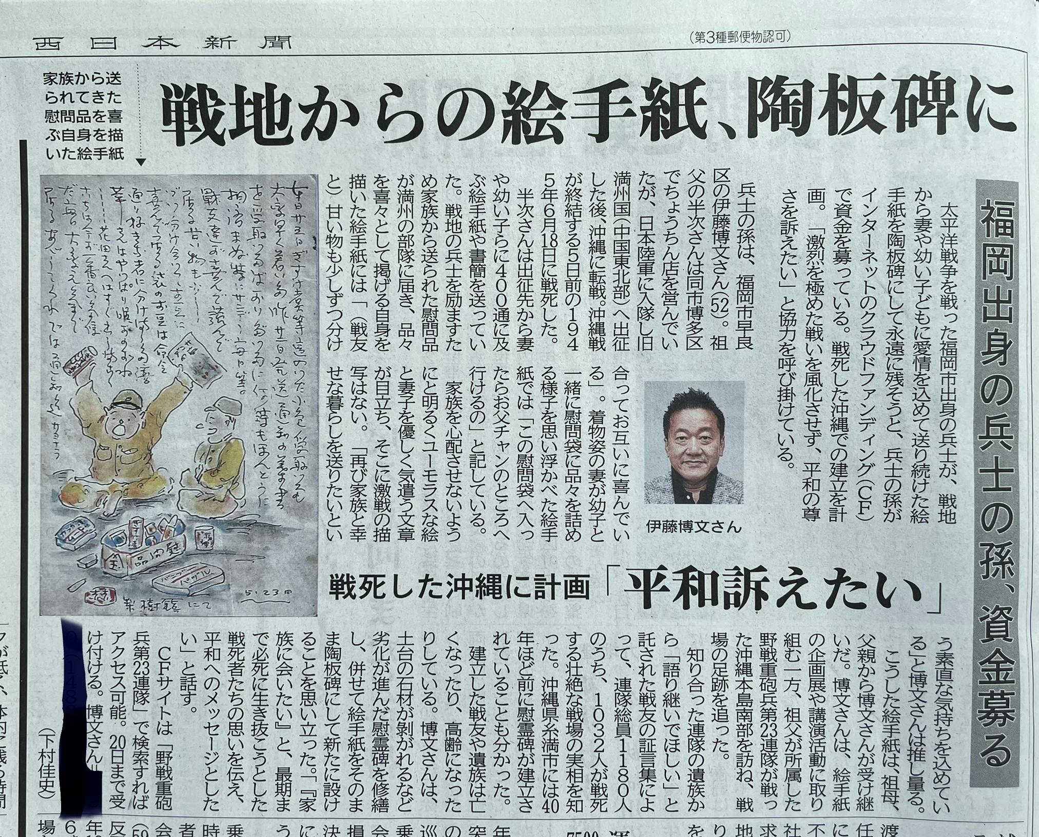 2021/11/19 22:54家族愛に満ちた祖父の絵手紙を陶板碑にして、沖縄戦を戦った野戦重砲兵第23連隊の慰霊碑の場所(沖縄県糸満市)へ。※写真:令和3年11月12日 西日本新聞朝刊(第三社会面) もっと見る