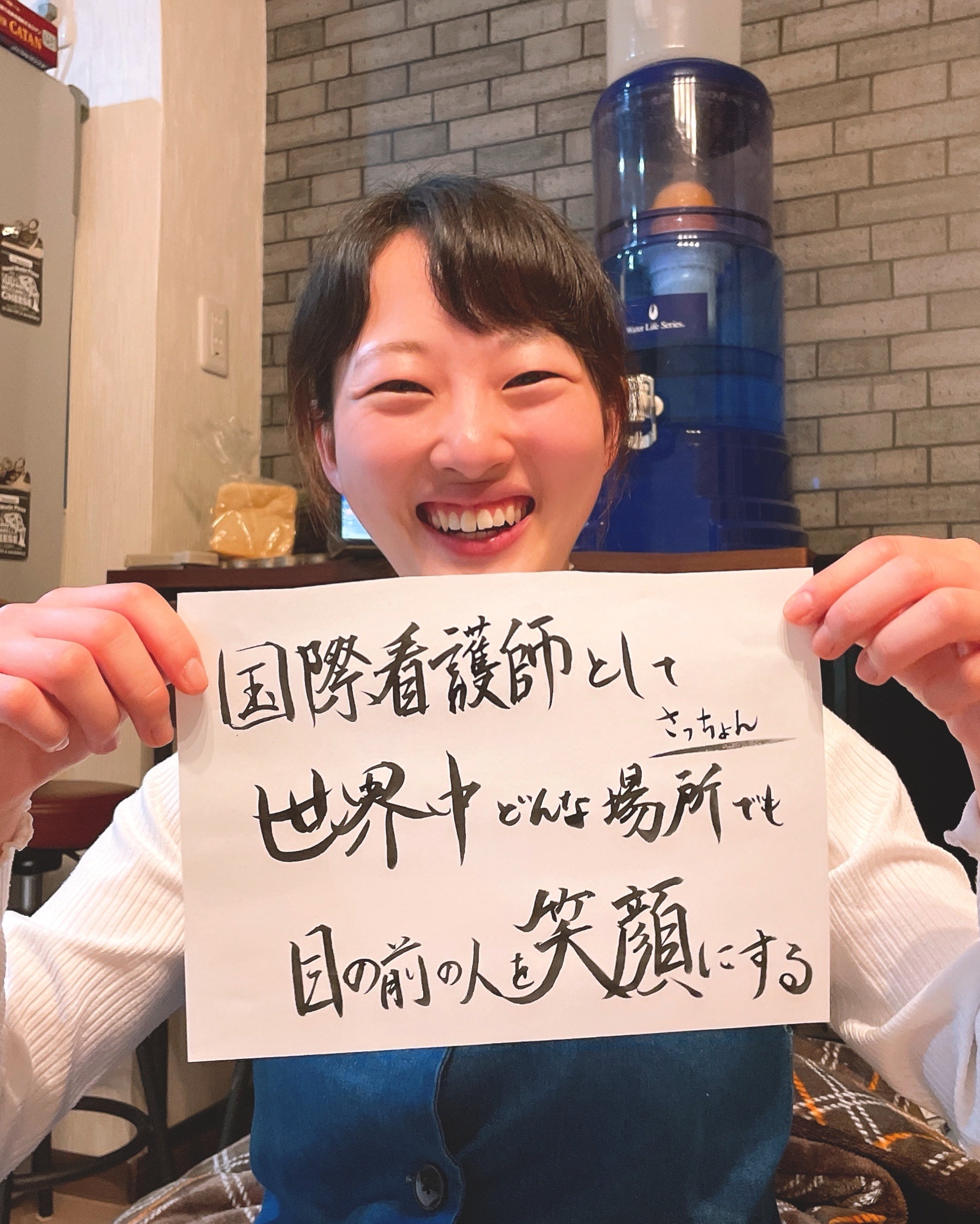 私は「世界中どんな場所でも、どんな状況でも、目の前の人を笑顔にする国際看護師」を目指しています。今までは、医療・教育・国際協力・エンターテイメントの分野で経験を積んできました。来年から大阪赤十字病院で看護師として働きます。よろしくお願いします。