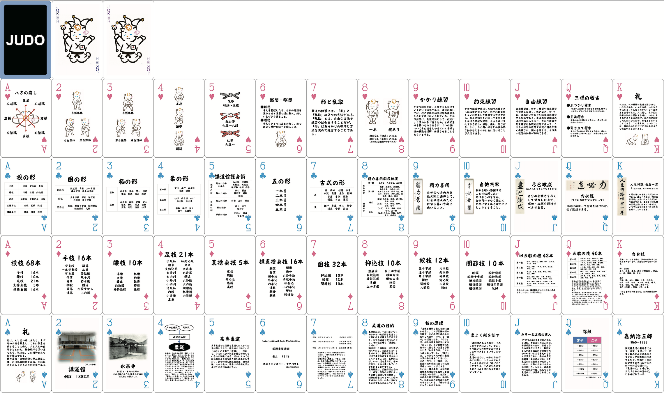 ヨーロッパでは昇級審査や昇段審査で柔道の知識の口頭試験や筆記試験が行われるところもあり、柔道の練習に励むだけでなく、歴史や基礎知識を持った素晴らしい柔道家がたくさんいます。しかし、日本では柔道に関することを学ぶ機会が少なく、正しい知識を持っていない人も多いのではないでしょうか。この「柔道トランプ」は、遊びながら楽しく柔道の基本知識に触れ、より深く柔道を理解することを目的として製作しました。柔道をしていない人にもこのトランプを通して柔道に興味を持っていただくことができるのではと考えております。