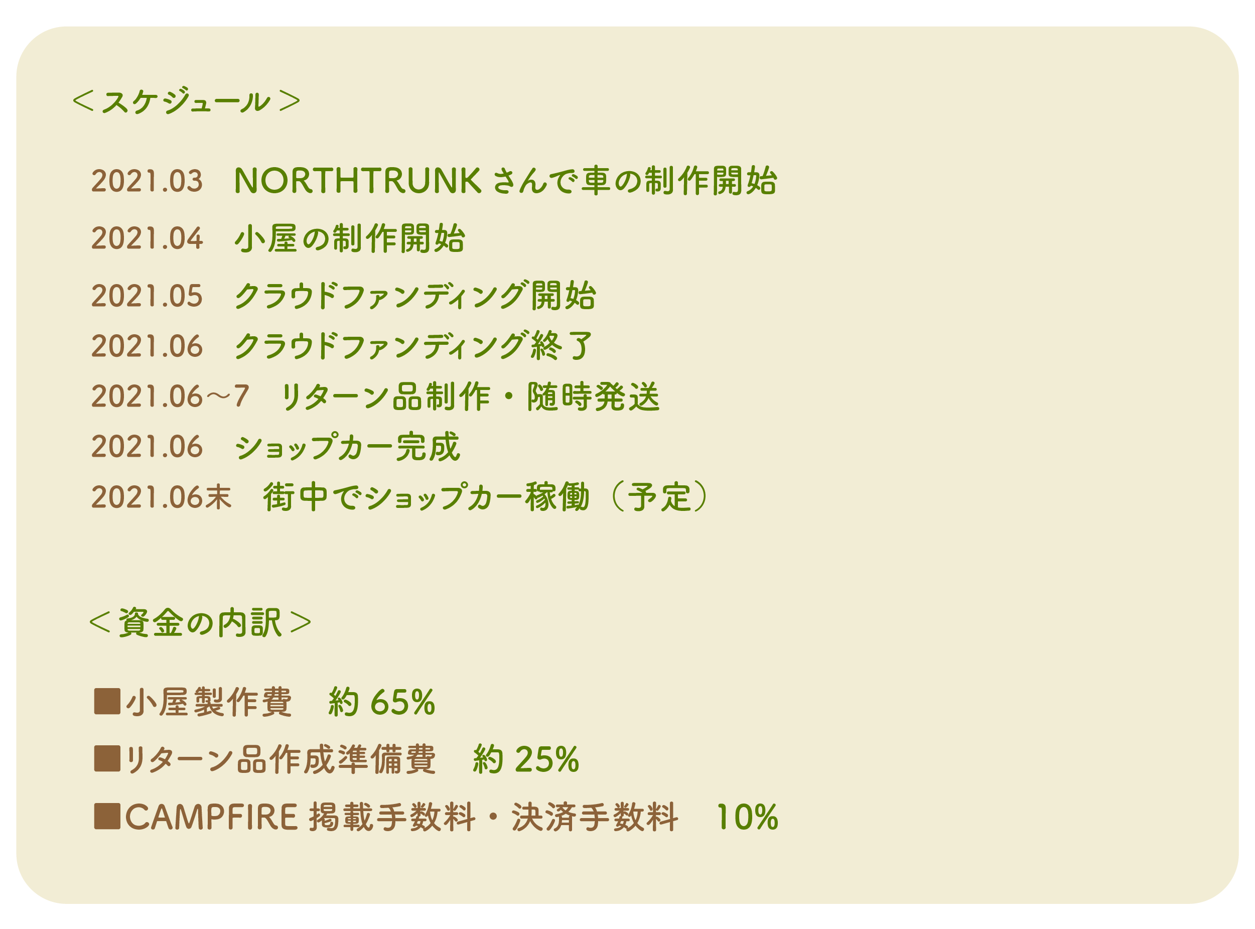 車に乗せる小屋の部分と機材、許可等にご支援を使わせていただきたいと思います。