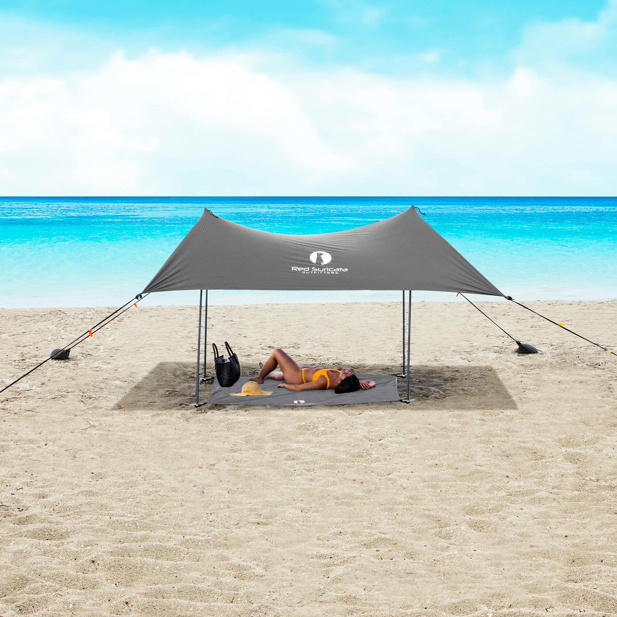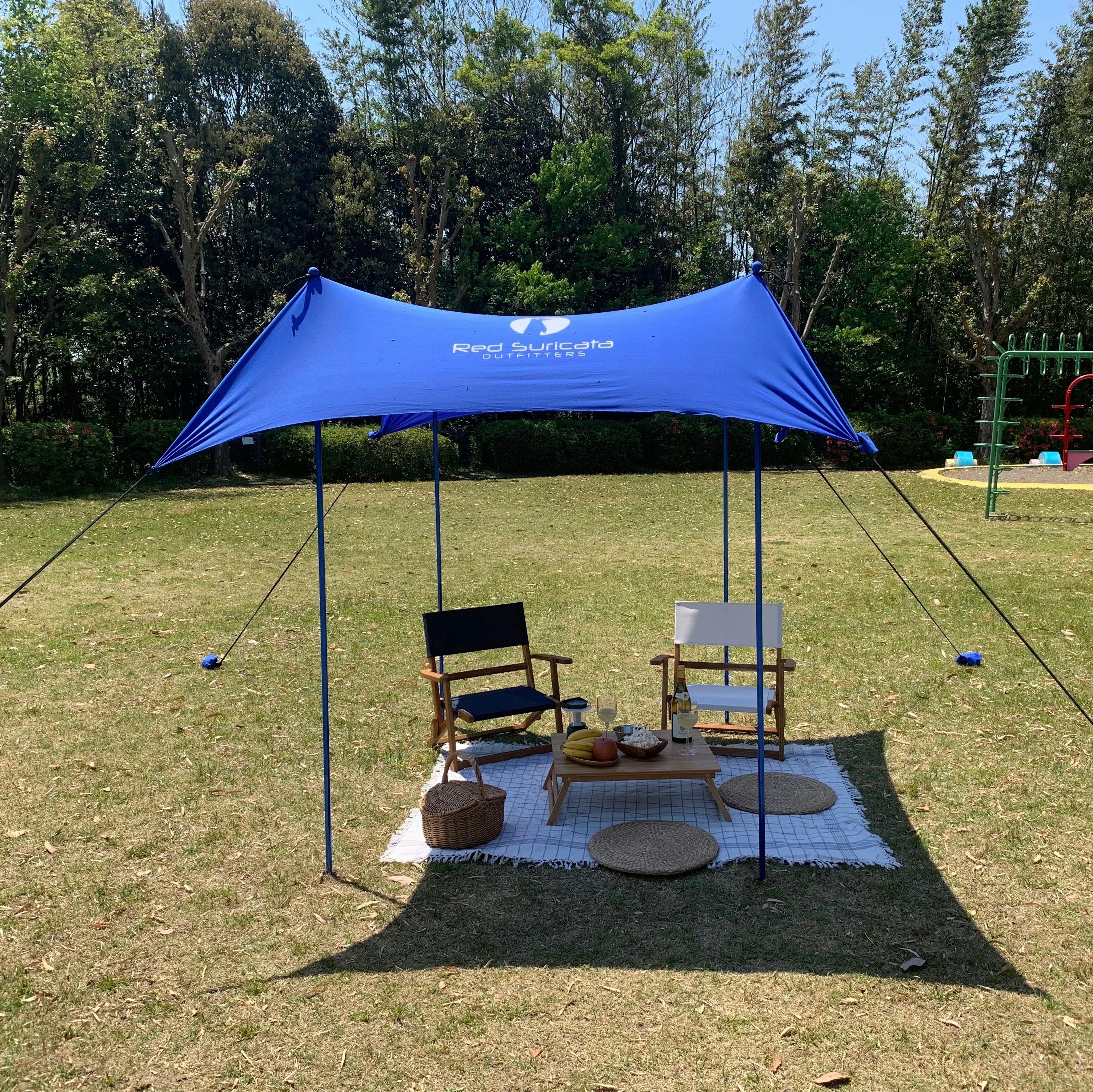 『RedSuricata ビーチサンシェード』は日陰が少ない場所でも直射日光を遮るサンシェルターです。伸縮性に優れたライクラ生地だから、使用するアルミポールの本数を調整して、簡単にサンシェードの角度を変えることができます。太陽が移動しても快適な日陰エリアが作れます。
