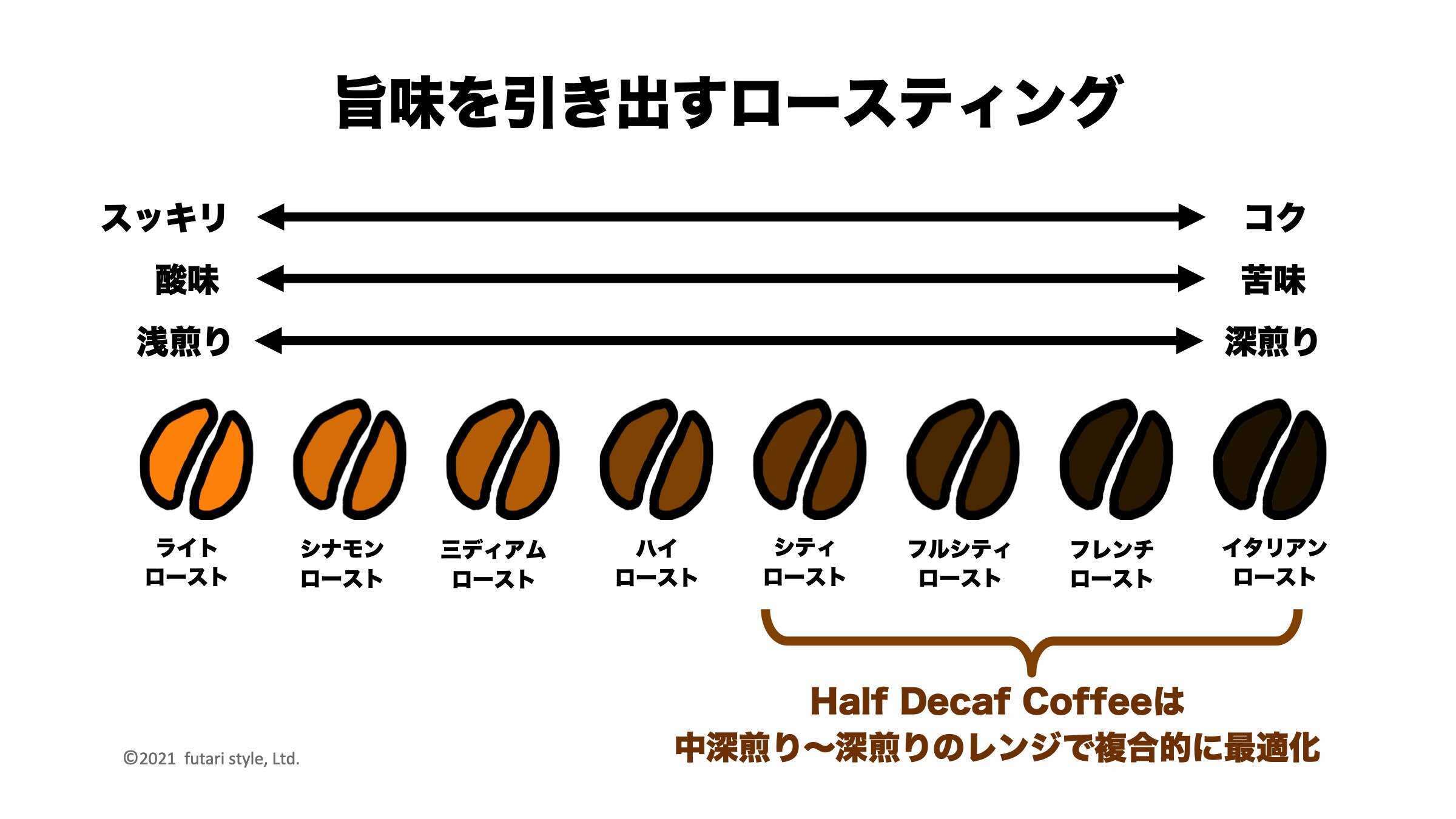 カフェイン除去処理(Water Deccaffeination Process)を施した豆と施していない豆を用い、最適な焙煎度合いで調合することにより、 カフェインは少なく・コーヒー豆本来の芳醇な味わいを実現しました。
