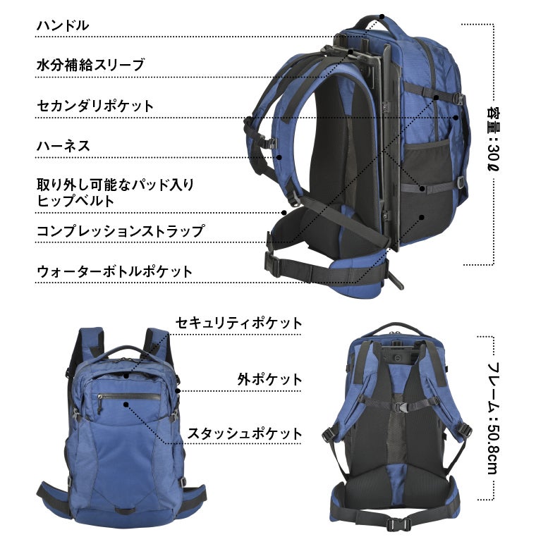 ・30ℓの容量で、1日に必要なギア、食べ物、衣類を収納できます。