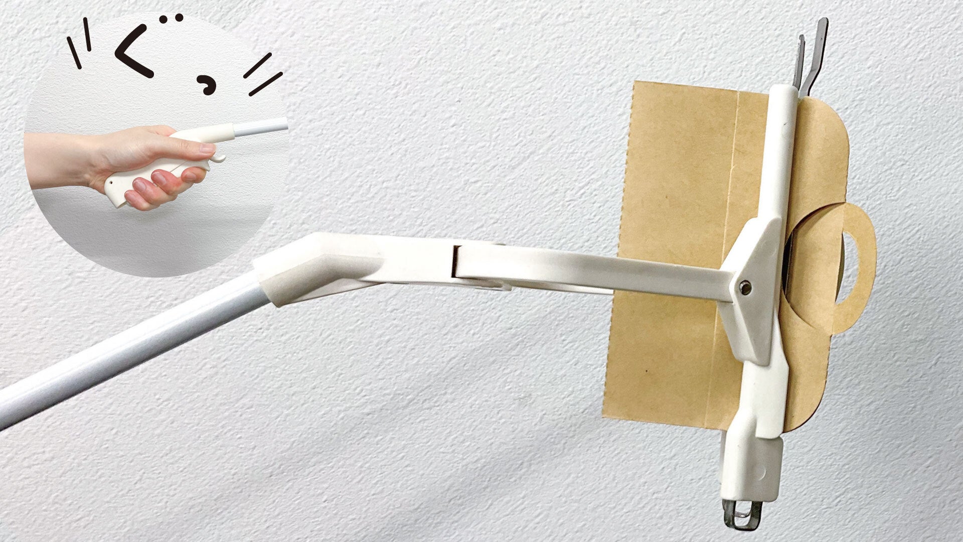 害虫捕獲器「ぱっくりん」とは、マジックハンドのような器具に粘着性のシートを装備し、害虫を後ろからひっつけ、ぱっと挟む道具です。