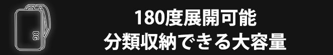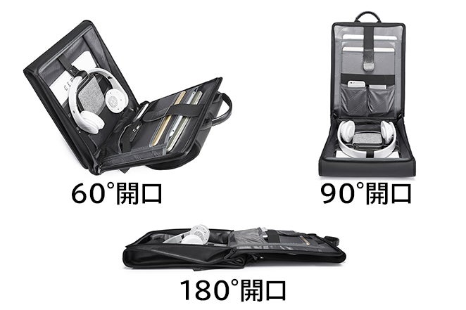 リュックは最大180度展開可能、荷物の整理や、物の出し入れに大変便利。