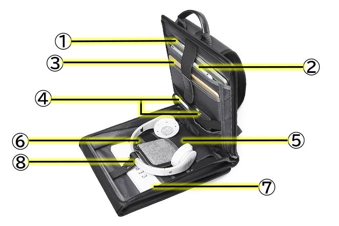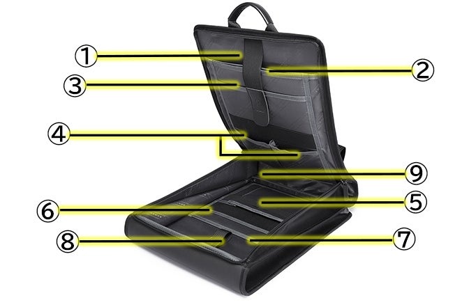 ①ノートPC用スペース(最大14インチ) ②IPAD用スペース ③タブレット用スペース ④小物収納ポケット ⑤財布ポケット ⑥携帯やモバイルバッテリー用ポケット ⑦書類ポケット ⑧ヘッドフォン用 ⑨メインスペース