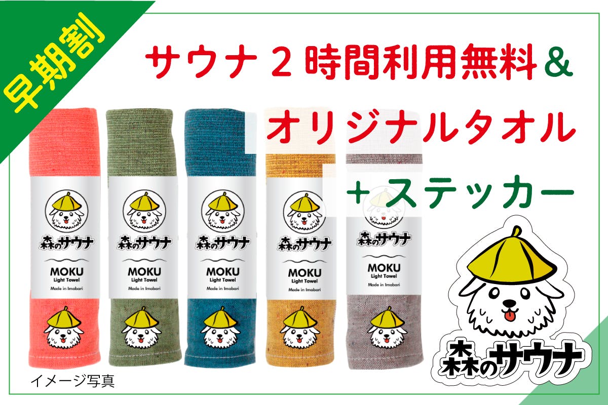 サウナ2時間利用券&オリジナルタオル+ステッカー完成したサウナログを2時間ご利用頂けるプランです。当施設看板犬ジーナがイメージキャラクターになったサウナロゴステッカーとオリジナルタオルをお送りします。※写真はイメージです。