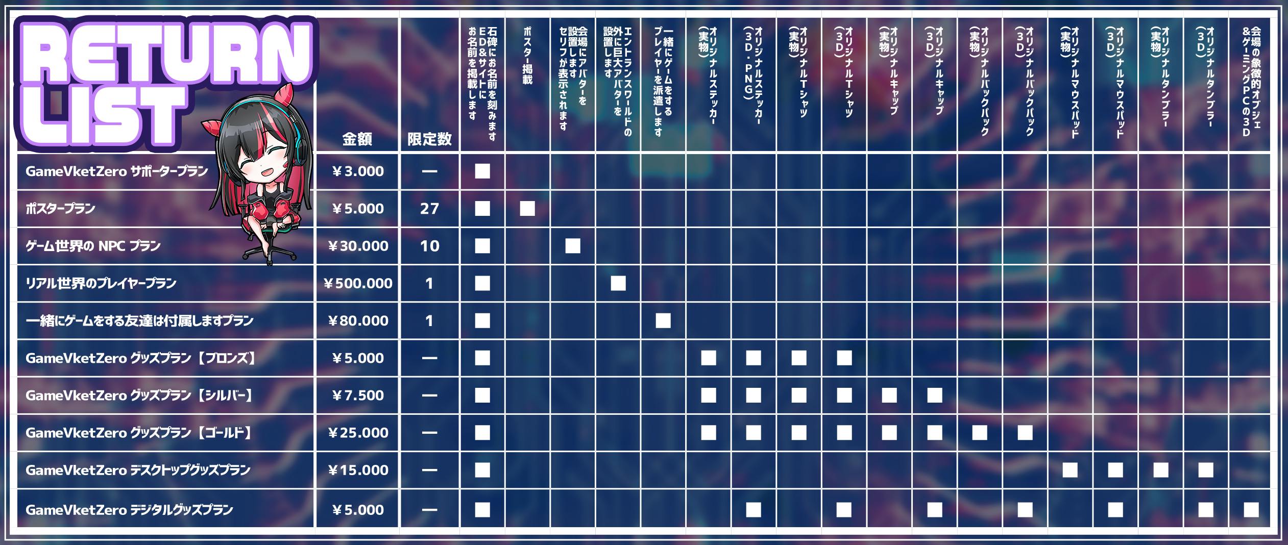 バーチャルの世界に入り込めるようなプランや、サイバーなゲームの世界を表現した各種グッズのリターンをお届けいたします!