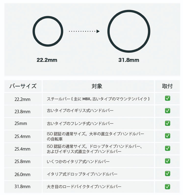 ※22.2mm~31.8mmの範囲内のバーは使用可能です