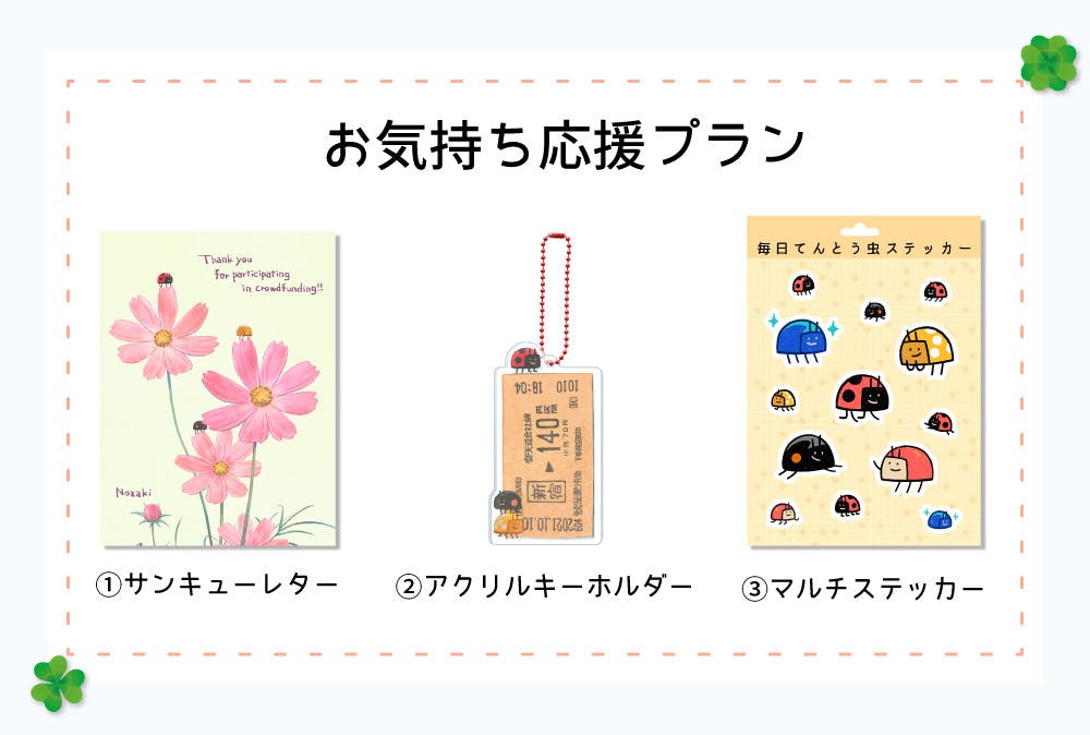 2021/08/26 15:01この度はたくさんご支援いただき、有難うございます!予想を超えるご支援と、たくさんの暖かいメッセージを頂き言葉で表現できないくらい嬉しいです。ようやく到着報告を聞けてホッとしています。ツイッターで #毎日てんとう虫ズ というハッシュタグを用意しました。到着報告や、いい写真が撮れたぞ!などなど、思いのままに使ってくださいね。これからもてんとう虫くんたちをよろしくお願いします!2021.8.26 ノザキ もっと見るリターンの発送につきまして