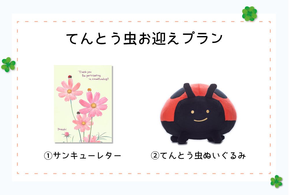 ▼てんとう虫ぬいぐるみと、今回のクラウドファンディングでしか手に入らない限定アイテムをお届けする豪華なプラン