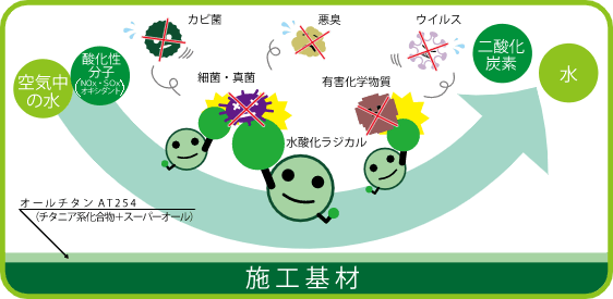 触媒とは自分自身は変化せず周囲の物質と科学反応を促進するため、摩耗して効果が無くなることがありません。この特徴を活用し私たちの生活に関わる問題解決のために開発されたものがオールチタンAT254です。有害物質・菌・ウイルスに対して効果的な作用する力が高く、長期間発揮し続けるメリットがあります。