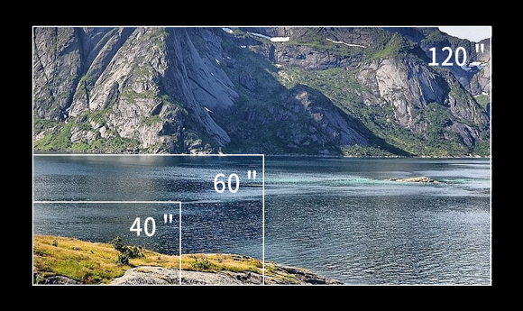 わずか2.6mの距離から100インチのサイズに投影。限られたスペースでも迫力ある映像が楽しめます。スクリーンのサイズは投影距離に応じて変更できます。