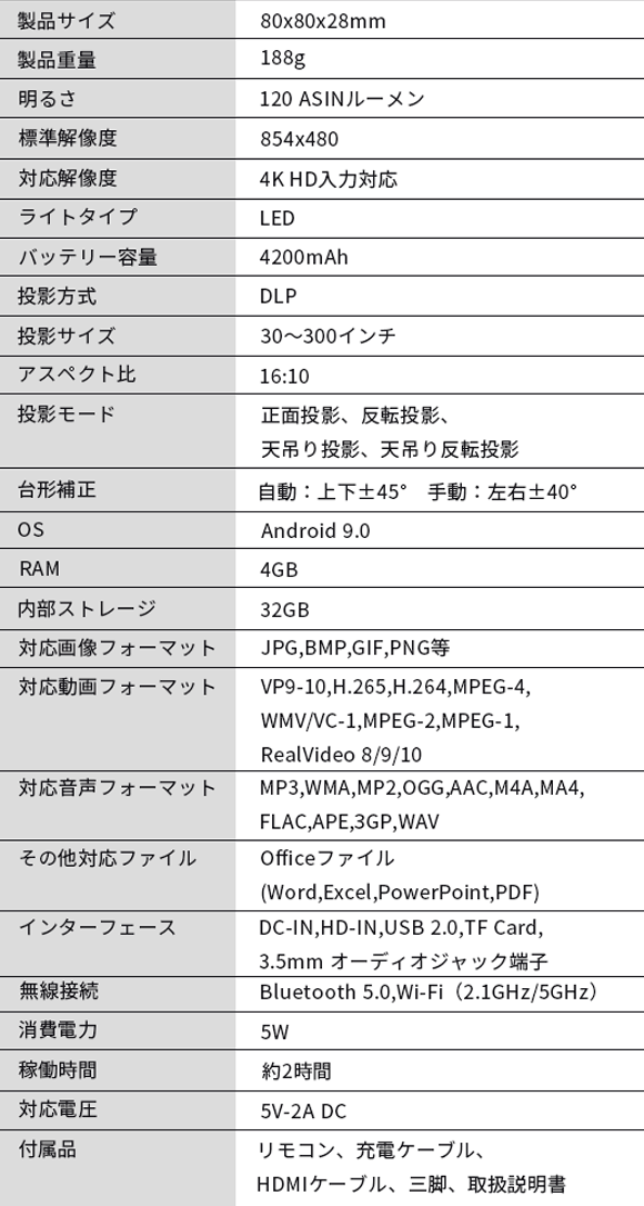 8cm×8cm手のひらサイズで最大300インチの映像出力。