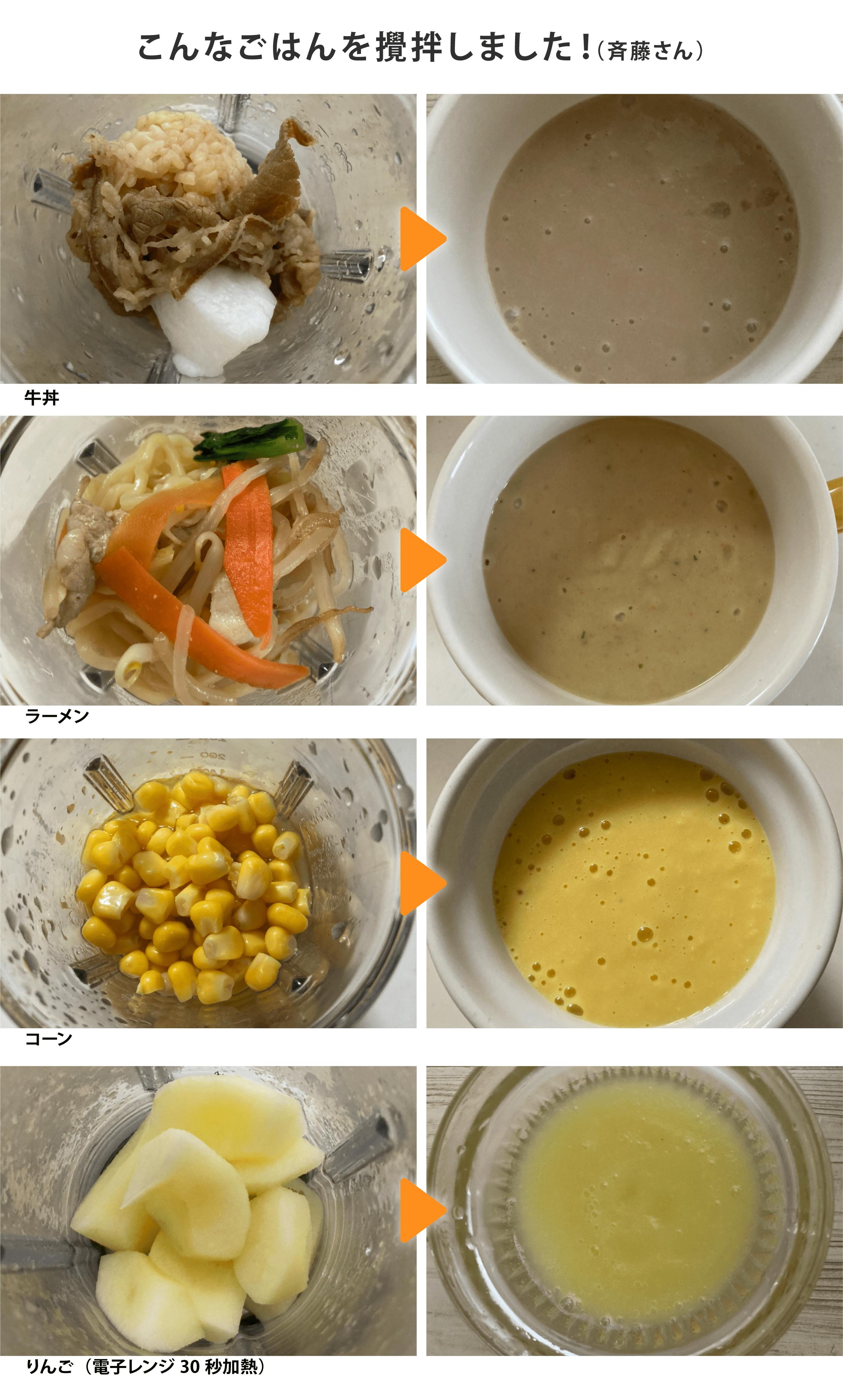 “かたい肉や繊維質の野菜も胃ろうで使えるなめらかなペーストに出来て”