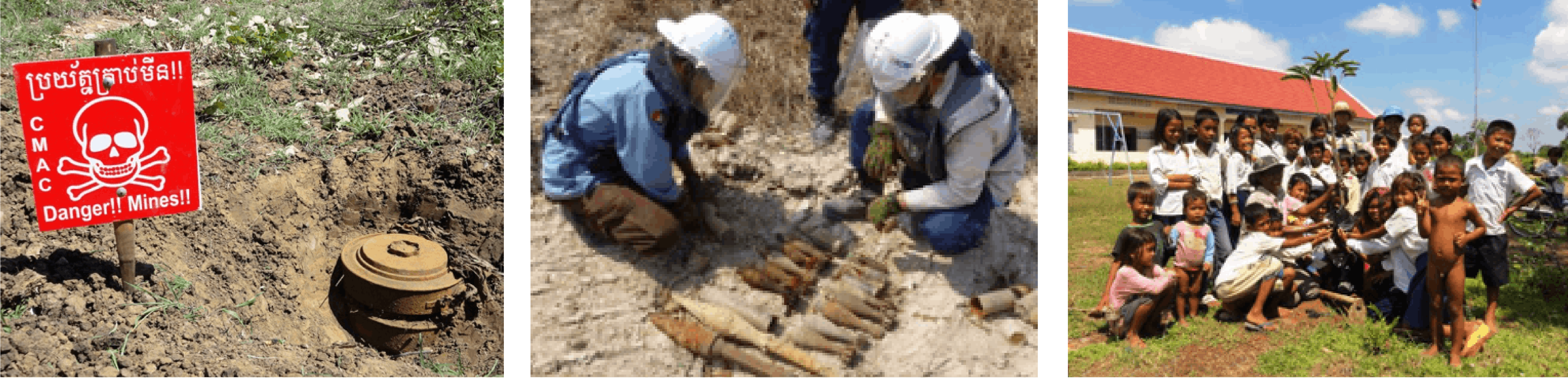 現在カンボジア、ラオス、パラオで地雷・不発弾の除去、ミクロネシアで沈船の油漏れ対策を行っています。また、地雷・不発弾を除去した跡地で道路建設、農地整備等住民の生活を改善する事業を行っています。