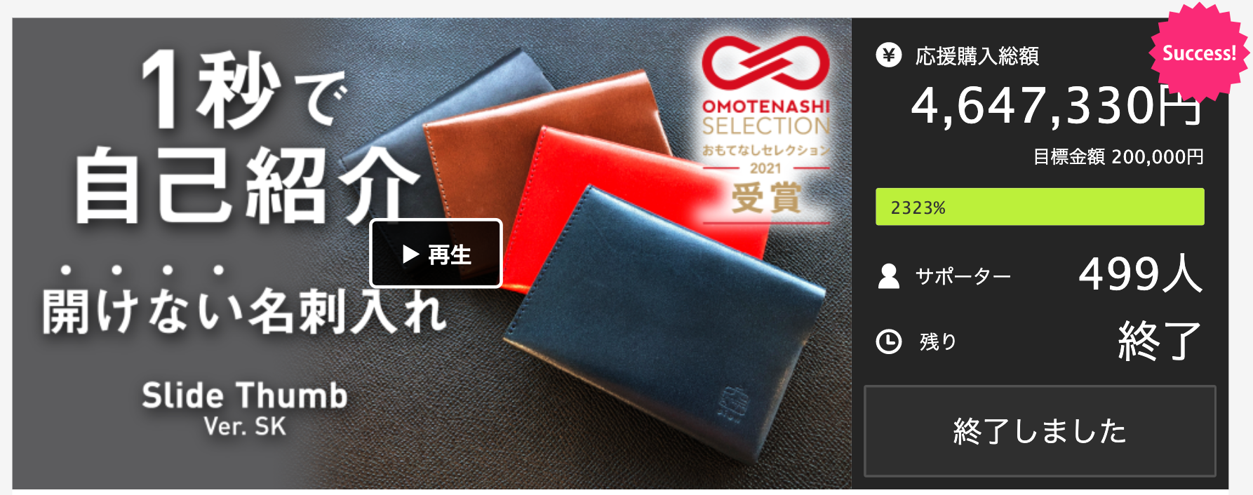 スライドサム ver. SKは、Makuakeの「名刺入れ」カテゴリの購入額でトップクラスの売上(おそらく歴代2位✳︎)を記録しました。✳︎2022年3月1日時点の自社調べ。