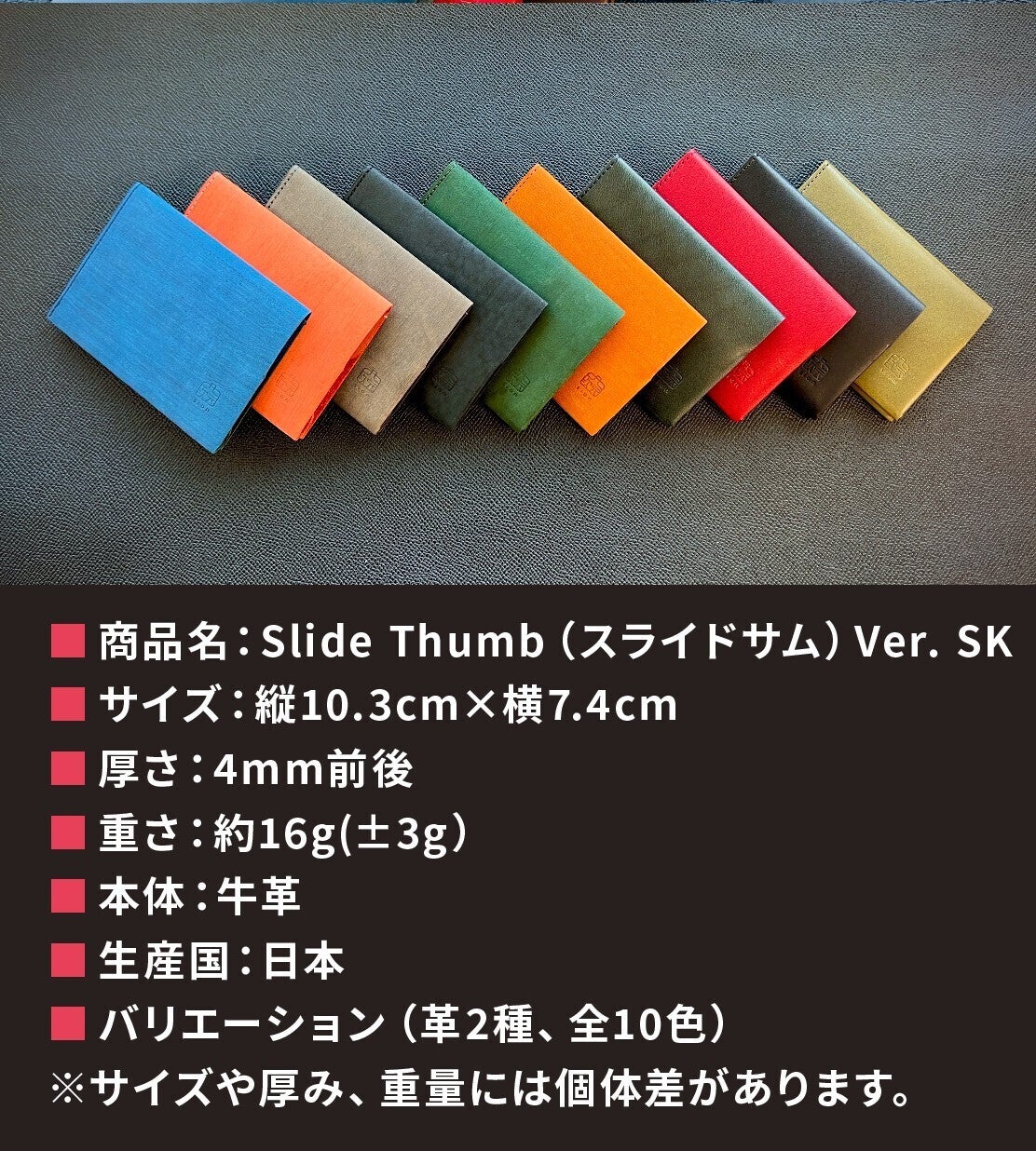 スライドサムのデザインは、革質を楽しんでいただけるよう、余計な装飾を排し、機能性を追求したシンプルなものにとどめています。