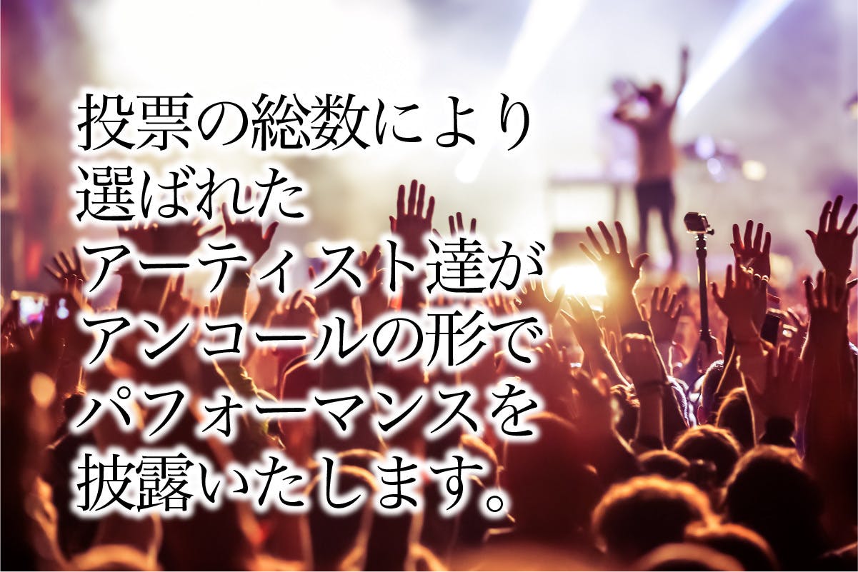 アップテンポ部門・バラード部門の2部門に分け、パフォーマンスが良いと感じたアーティストをお一人様につき部門ごとに1組ずつ投票していただき、投票の総数により選ばれたアーティスト達がアンコールの形でパフォーマンスを披露いたします。