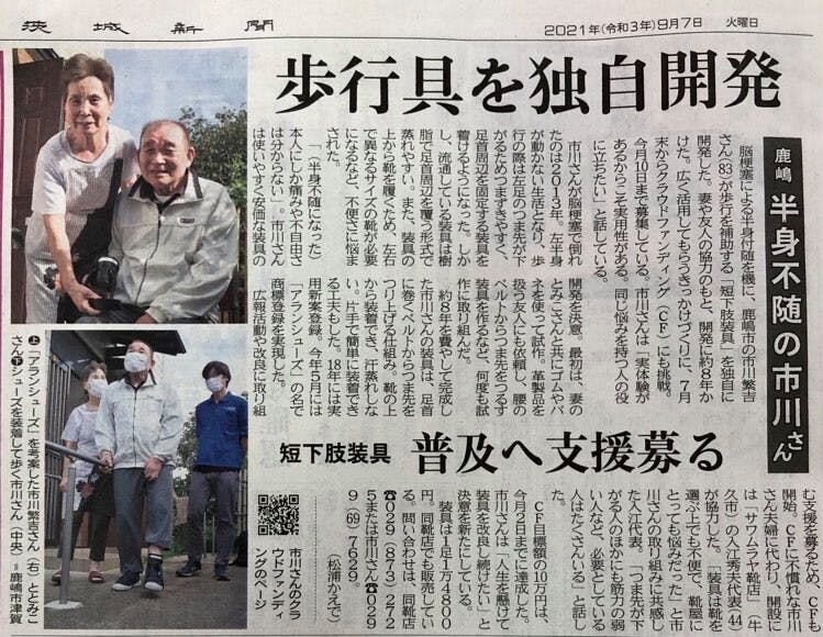 2021/09/07 12:34茨城新聞・9月7日 脳梗塞による半身付随を機に、鹿嶋市の市川繁吉さん(83)が歩行を補助する「短下肢装具」を独自に開発した。妻や友人の協力のもと、開発に約8年かけた。広く活用してもらうきっかけづくりに、7月末からクラウドファンディング(CF)にも挑戦。今月10日まで募集している。市川さんは「実体験があるからこそ実用性がある。同じ悩みを持つ人の役に立ちたい」と話している。 市川さんが脳梗塞で倒れたのは2013年。左半身が動かない生活に。歩行の際は左足のつま先が下がるためつまづきやすく、足首周辺を固定する装具を着けるようになった。しかし、流通している装具は樹脂で足首周辺を覆う形式で蒸れやすい。また、装具の上から靴をはくため、左右で異なるサイズの靴が必要になるなど不便さに悩まされた。 「(半身不随になった)本人にしか痛みや不自由さは分からない」。市川さんは使いやすく安価な装具の開発を決意。最初は、妻のとみこさんとともにゴムやバネを使って試作。革製品を扱う友人にも依頼し、腰のベルトからつま先をつるす装具を作るなど何度も試作に取り組んだ。 約8年を費やし完成した市川さんの装具は、足首に巻くベルトからつま先を釣り上げる仕組み。靴の上から装着でき、どのような靴にも装着可能で汗蒸れしない。片手で簡単に装着できる工夫もした。18年には実用新案登録。今年5月には「アランシューズ」の名で商標登録を実現した。 広報活動や改良に取り組む支援を募るため、CFを開始。CFに不慣れな市川さん夫婦に代わり、開設には「サワムラヤ靴店」の入江秀夫代表(44)が協力した。「装具は靴を選ぶ上でも不便で靴屋にとっても悩みだった」と市川さんの取り組みに共感した入江代表。「つま先が下がる人のほかにも筋力の弱い人など必要としている人はたくさんいる」と話した。 CF目標額の10万円は、今月2日までに達成した。市川さんは「人生をかけて装具を改良し続けたい」と決意を新たにしている。 装具は1足1万4800円(税込み)。同靴店でも販売している。問い合わせは、サワムラヤ靴店☎029(873)2725または市川さん☎0299(69)7629早速、市川さんと同じ悩みを抱えている方から問い合わせがありました!!もっと多くの必要な方に届くように頑張ります!!今後もよろしくお願い申し上げます。 もっと見る