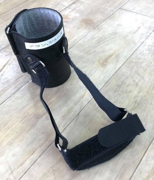 今回のプロジェクトでは、新開発の「ベルト式歩行装具」 を製作しました。名前は「ア」で始まると皆様に覚えられやすいという事で「アランシューズ」(商標登録済み第6390404号 )