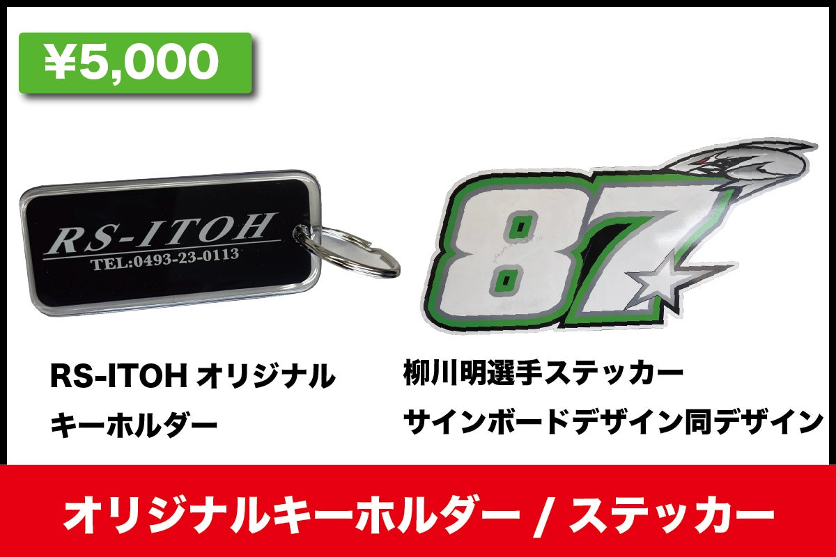 ・KAWASAKIのレジェンドライダー「柳川明」幻の”87”ステッカーとRS-ITOHのオリジナルキーホルダーのセットです。