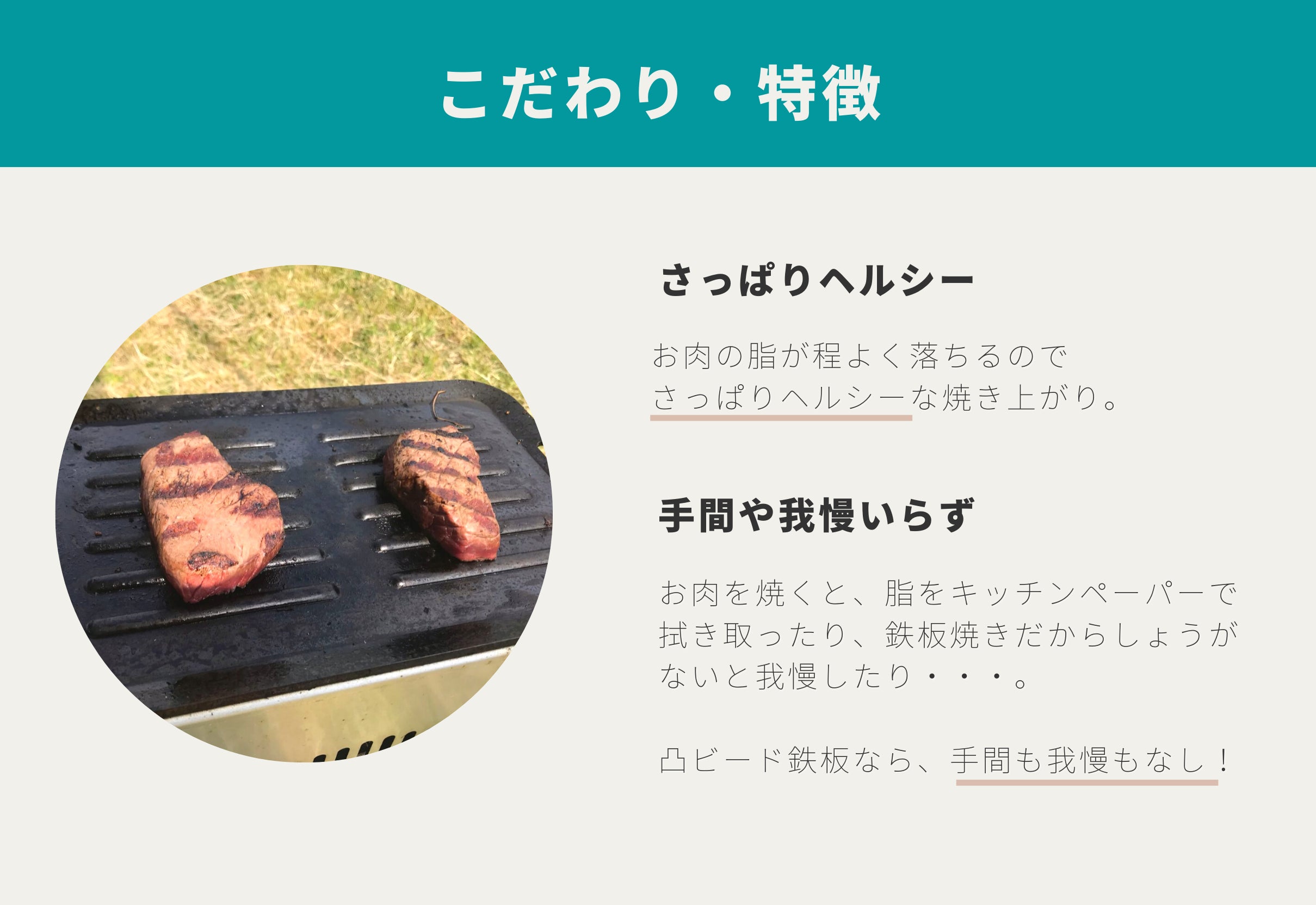 ・分厚い鉄板にビード凸加工を施しているため、焼き上がりの見た目も味も最高です。