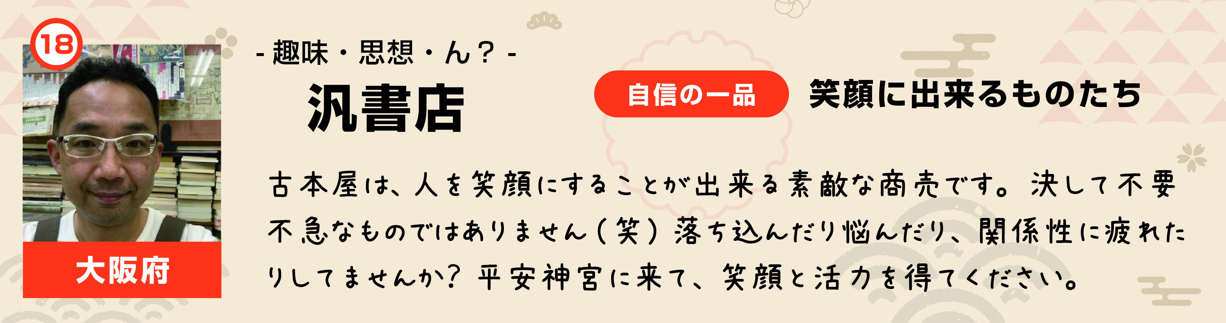 はじめまして。大阪駅前第3ビルで小さな古書店・汎(はん)書店を営んでいる、船橋 栄日(えいひ)と申します。昭和44年生まれ、A型、牡羊座、動物占いは「コアラ」の陽気なオヤジです。大学3年と大学1年の2人の息子と嫁の4人、生かされている事に毎日感謝の家族です。