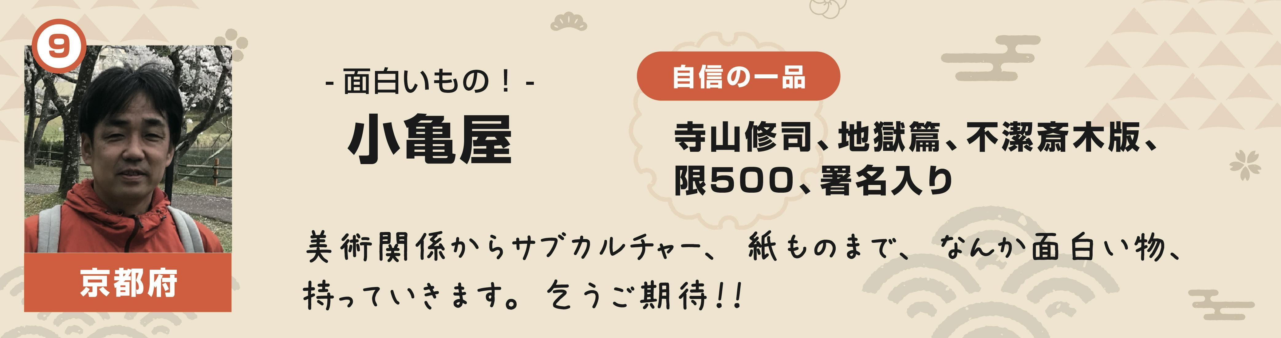 参加各店からは、この度の古本まつりにかける想いや、皆様に伝えたいメッセージが届いています。それを紹介します。ありのままの店主をご紹介していますので、少々クセの強い画像もございます。何卒ご了承くださいませ。