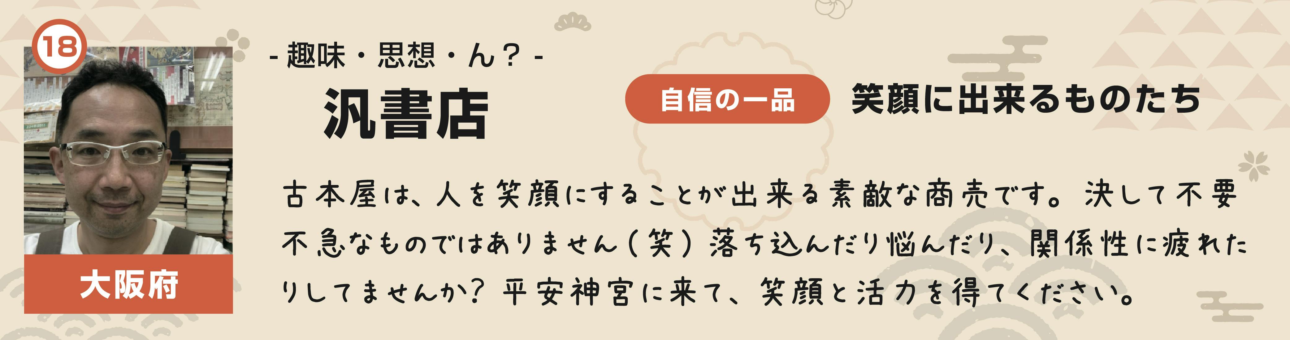 2021/06/26 13:15みんなでつくる古本まつり、無事に終えることが出来ました。支援いただきました皆様には、心より感謝を申し上げます。本当にありがとうございました。開催初日、二日目は緊急事態宣言下、なかなか宣伝もできず、取り上げてももらえず困難を極めましたが、意外なことに、月曜日にアルバイトのツイートした内容がバズり、火曜日は学生中心に押し寄せ盛況に、また、その流れで朝日新聞が取材に来てくれ、最終日の朝刊に載りました。最終日は「新聞見ましたよ〜〜」というお客さんが押し寄せ、先日の勉強熱心な学生たちと合わさり、古本まつりの最終日としてはあり得ない程の盛り上がりを見せました。最後までできることをし、諦めなければ何かを引き寄せられるんやと、心からおもいます。「続けて下さいね」「いい場所で、いい雰囲気で、京都の楽しみが一つ増えました」「久しぶりに楽しい時間をありがとうございました」、、、次々にかけて頂く言葉に、ここに至るまでの苦労した時間が全て報われました。皆さんの熱い思いと、深い気持ちに、心からありがとうの感謝を送ります。会場の撤収も終わり、平安神宮は元の静謐な空間に戻りました。このイベント、クラウドファンディングはどうなるかわかりませんが、「平かに安まる」、、、、心と世界の平安に想いを寄せたイベントとして、来年度から継続して行う予定です。また皆さんにお会いできる日を、心から楽しみにしています。ありがとうございました。汎書店 船橋栄日 もっと見る皆さんを、心からお待ちしていま〜〜す^^ 着々と準備は進んでいます!!