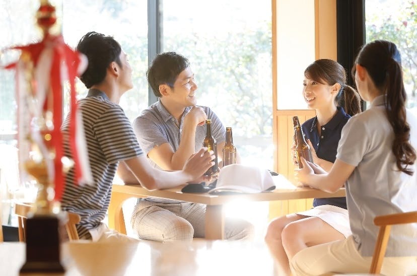 ゴルフ場ミーティングルームで連絡先交換などの懇親会