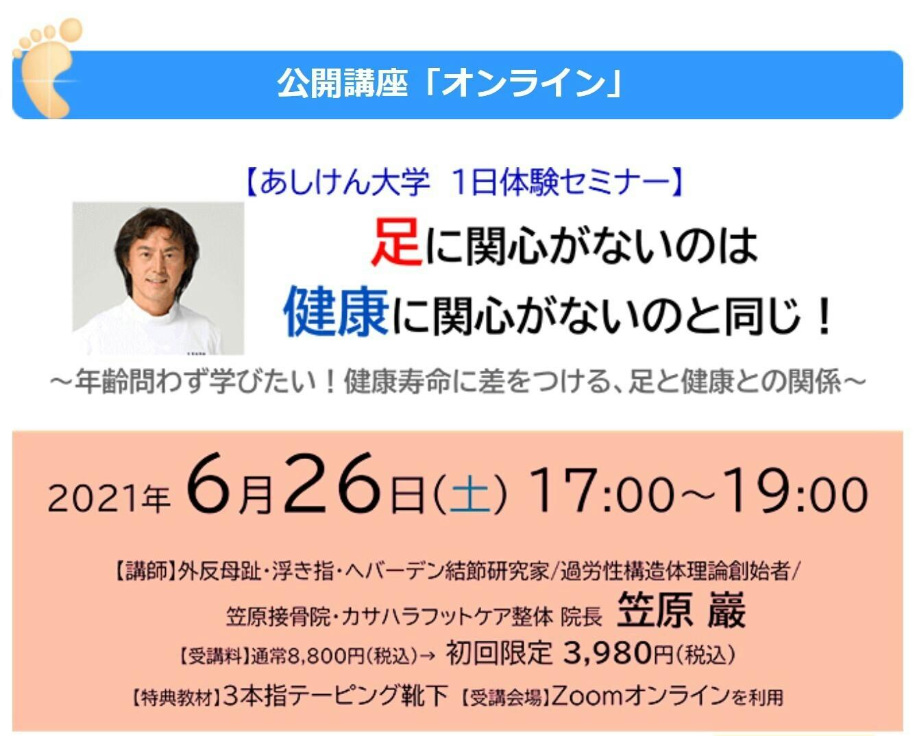 2021/06/23 11:06初めてのクラウドファンディング挑戦も、あっという間に残り6日となりました。ご支援いただいた皆さまには、厚く御礼申しあげます。今週土曜日には、あしけん(足と健康)大学の1dayセミナーを開講いたします。いつも健康な人と、いつも調子が悪い人との差は、実は「足」に隠れた原因があることがまだまだ知られていません。身体の土台『足裏』から全身のバランスを整えることによって、自然と正しい歩行が促され、姿勢がよくなり、足・ひざ・腰・首の痛みや身体の不調【未病】を自分で改善することができます。今回の講座では、履くだけで足裏のバランスが整って、姿勢が良くなる『3本指テーピング靴下』を教材に使って、笠原巖が「足と健康」の基礎知識を、実演を含めてていねいにお伝えいたします。いつまでも健康で若々しく過ごすきっかけになることは間違いありません!教材の靴下は受講料に含まれていますので、すぐにその日から実践することができます。お申し込み期限は、明日6月24日(木) です。<お申し込みはこちらから>あしけん大学1day体験セミナー(オンライン)(特典付き)オンラインで、皆さまとお会いするのを楽しみにしております♪ もっと見る