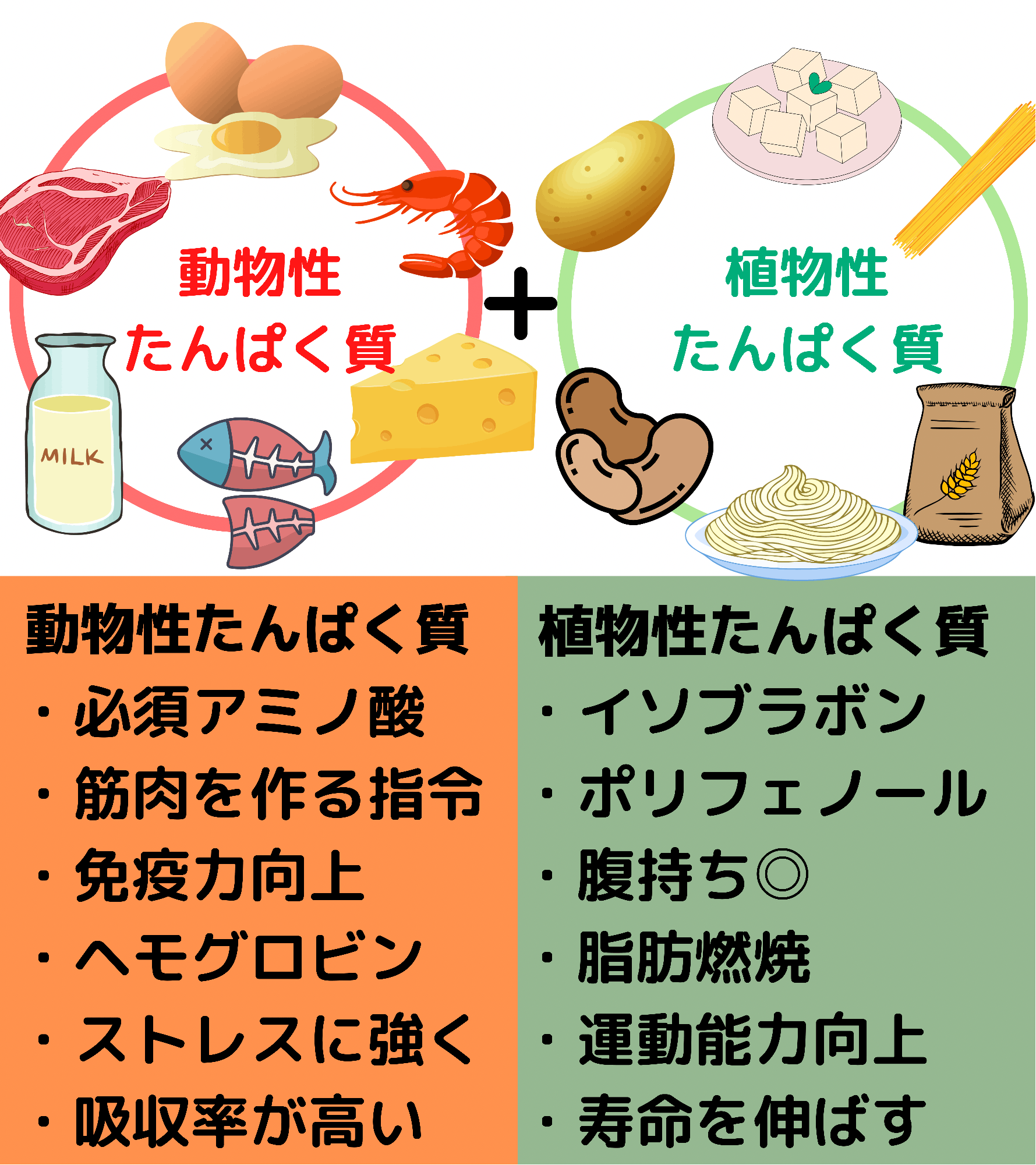 たんぱく質には植物性たんぱく質と動物性たんぱく質の2種類があり、それぞれにメリットがあり同時に摂取することで相乗効果が期待できます。