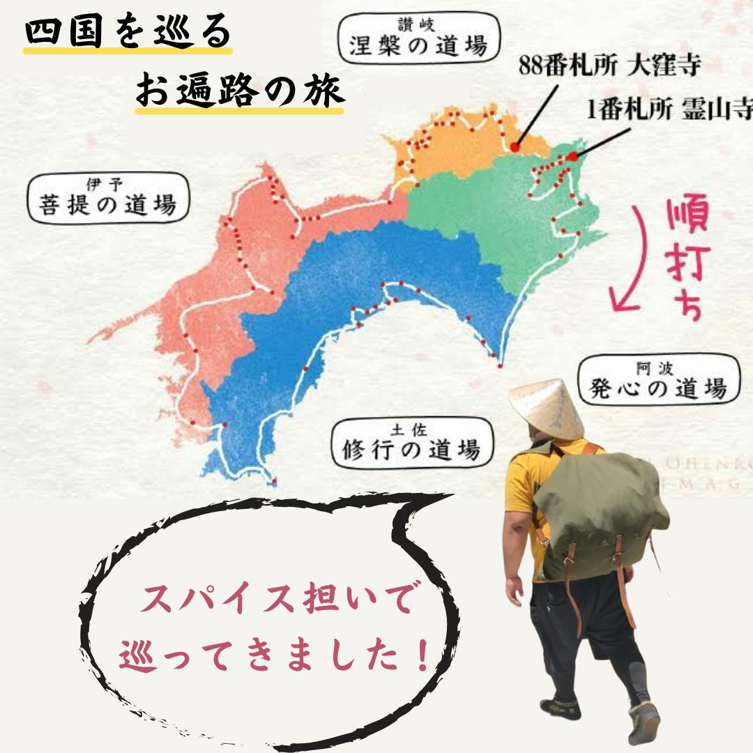 お遍路はよく「自分探しの旅」だと言われていますが、本当は切羽詰まった「お願い」を叶える力があると言われています。昨今のコロナウイルスの氾濫による苦しい状況を脱却できるよう願いを込めて、去年の年末年始に空海が開山した一番から八十八番の霊場をスパイスを担いで実際に礼拝してきました。