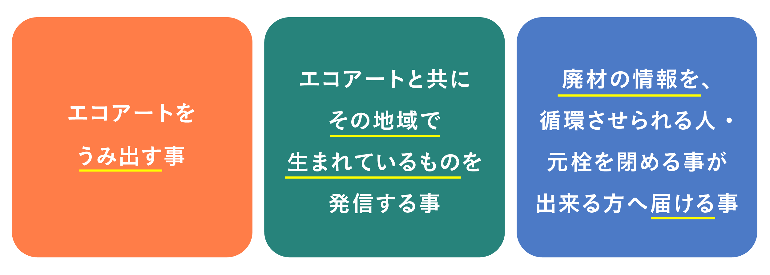 このプロジェクトで廃材を循環させるモデルをたくさん作り、どんな地域や廃材でも循環させられる社会を目指します。エコアート作品はその循環をまわすひとつの手段です。
