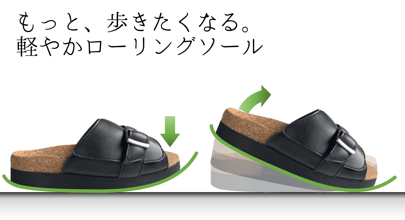 歩きやすさを考えて、つま先をローリング形状にしました。つま先に荷重をかけるだけで、自然に足が前に運びます。緩やかな下り坂を歩いているよな感覚に、「もっと、歩いていたい。」と思うはずです。また、ローリング系のシューズにありがちな不安定感がないよう、接地面積は広めにとってます。
