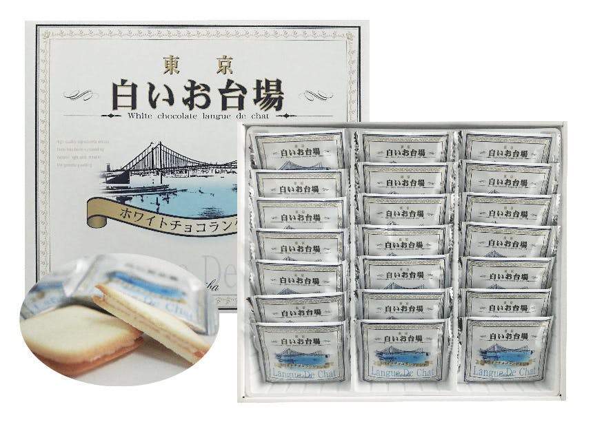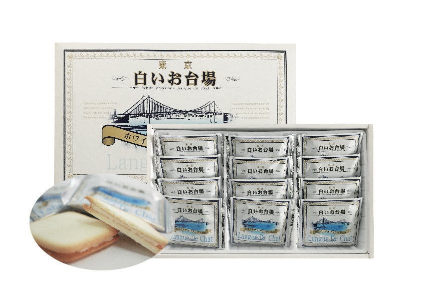レインボーブリッジが印刷されたパッケージ、ユニークなネーミングのラングドシャクッキーです。