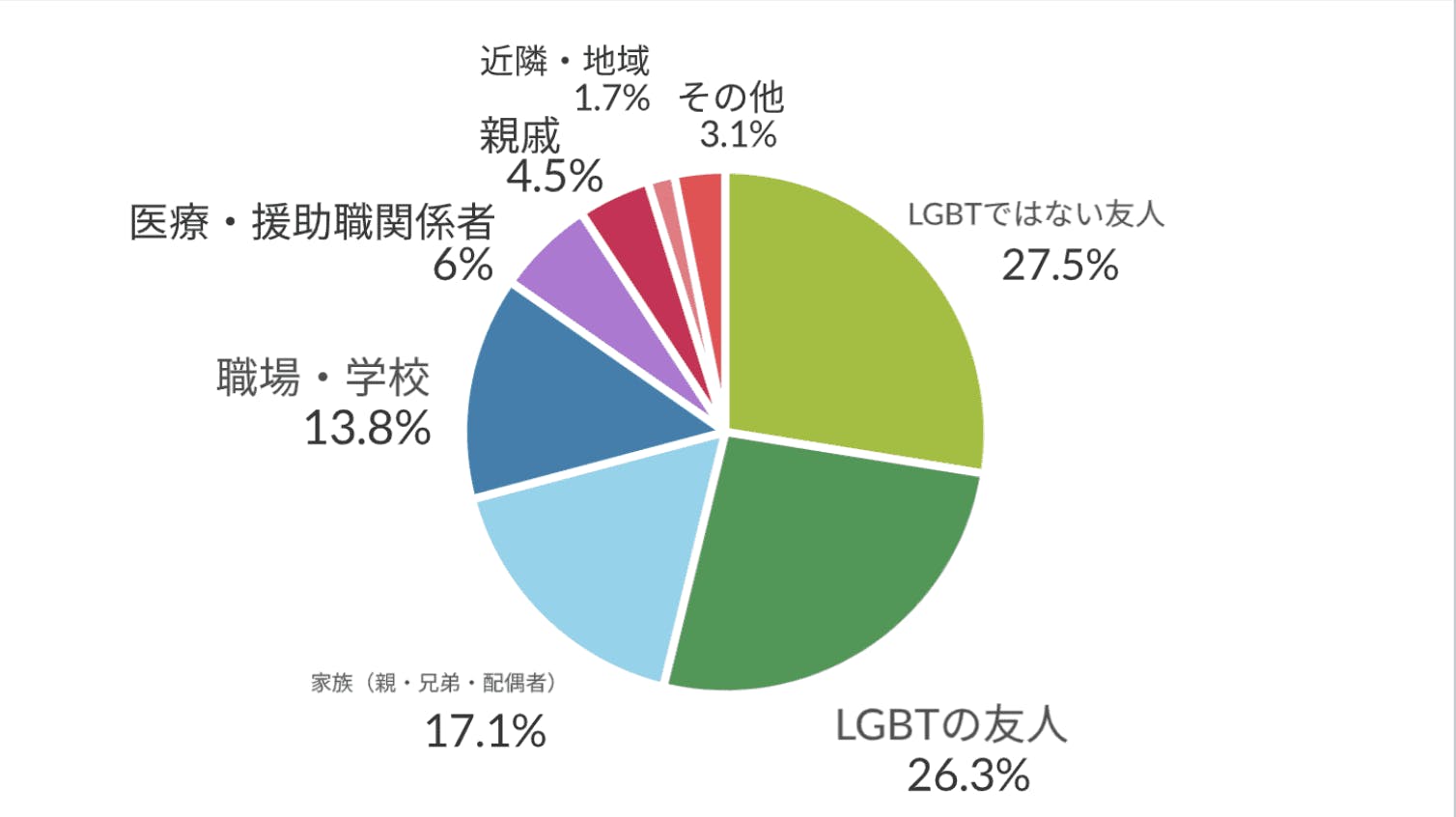 NHKが行った当事者を対象としたアンケート調査(全2401人)によると、カミングアウトした相手は「友人」が最も多く、身近な家族(親、兄弟、配偶者など)は半数程度で、最も身近な家族に対して打ち明けることができない「カミングアウトの壁」が存在することがわかっています。