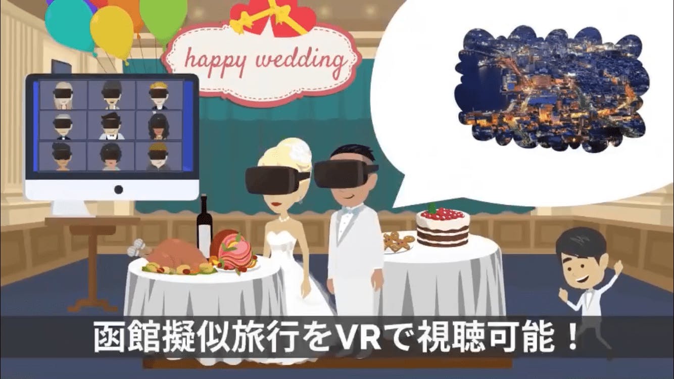 オンライン結婚式では、函館擬似旅行をVRで視聴可能に、婚礼料理には函館特産料理を提供し(お二人にはもちろんゲストにも提供)、結婚する2人にもゲストにも、結婚式が終わる頃には函館旅行を堪能した気持ちになっていただくプランです!
