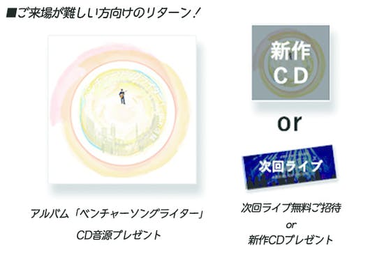 2017/12/25 17:29「応援したいけど、遠くて行けない!」「行きたいんだけど、当日すでに予定が...。」 そんなお声をいただいたので、イベントのご来場が難しい方向けのリターンを追加しました!!---------・CD →アルバム「ベンチャーソングライター」のCD音源をプレゼントいたします ・次回ライブ無料ご招待 or 新作CDプレゼント------ ライブについては、直近1/14(日)にワンマンライブがございます!CDについては、現在、作成中のFighting Sailorやアントレプレナーズなどを収録した、次回のCDをプレゼントいたします!遠方の方や当日ご予定がある方は、ぜひぜひこちらをチェックしてみてください!! もっと見る