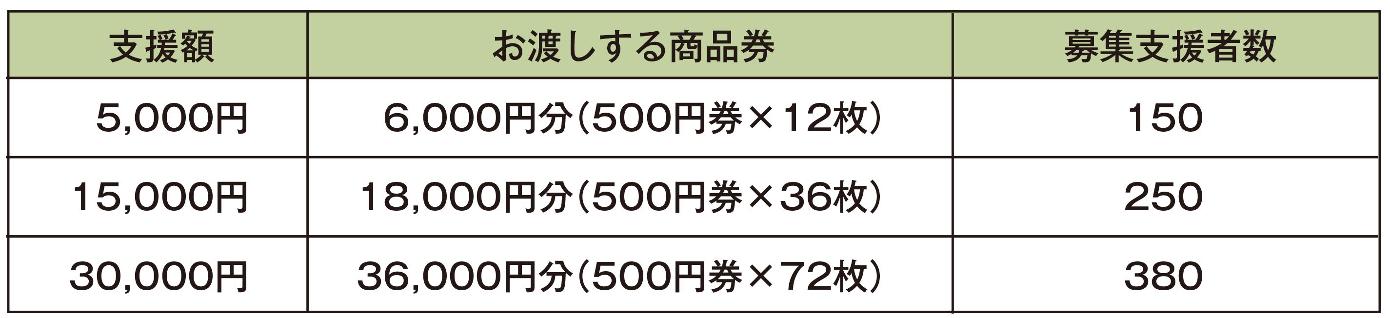 ※同一の方から30,000円を超えるご支援があった場合でも30,000円を超える分の商品券は発行されません。返金もいたしませんので、予めご了承ください。