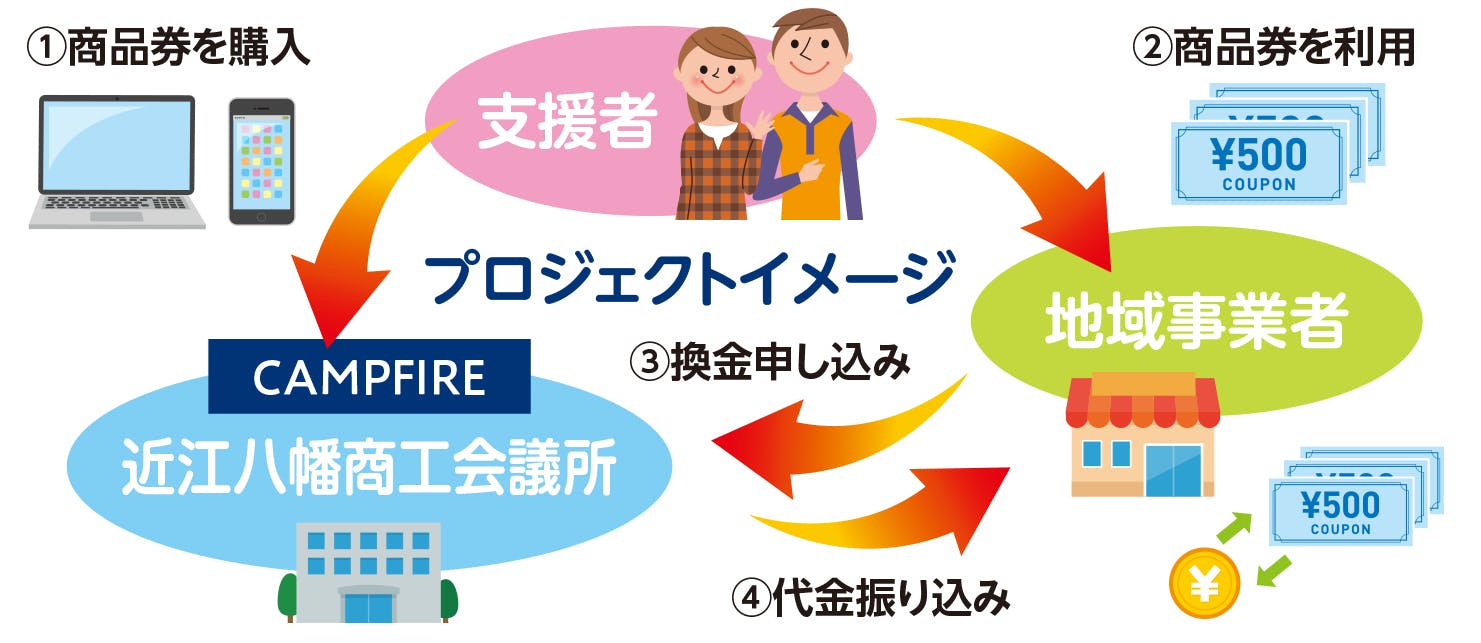 コロナ禍で近江八幡のにぎわいや交流を支えてきた多くの飲食店、小売店、宿泊施設など、様々な事業者が経営の危機に直面したことを受け、市内の元気を取り戻すため、近江八幡商工会議所と安土町商工会がプロジェクトの起案者となり、地域で使える20%のプレミアムを付与した商品券を販売する事で地域経済活性化を図ろうと立ち上げたプロジェクトです。